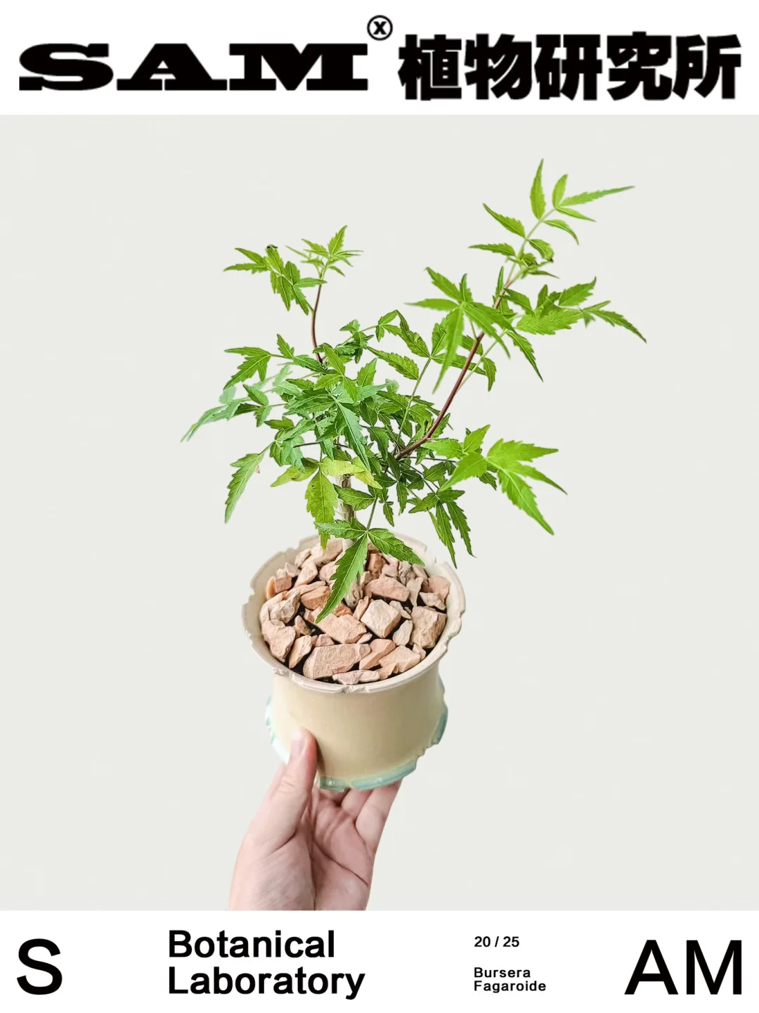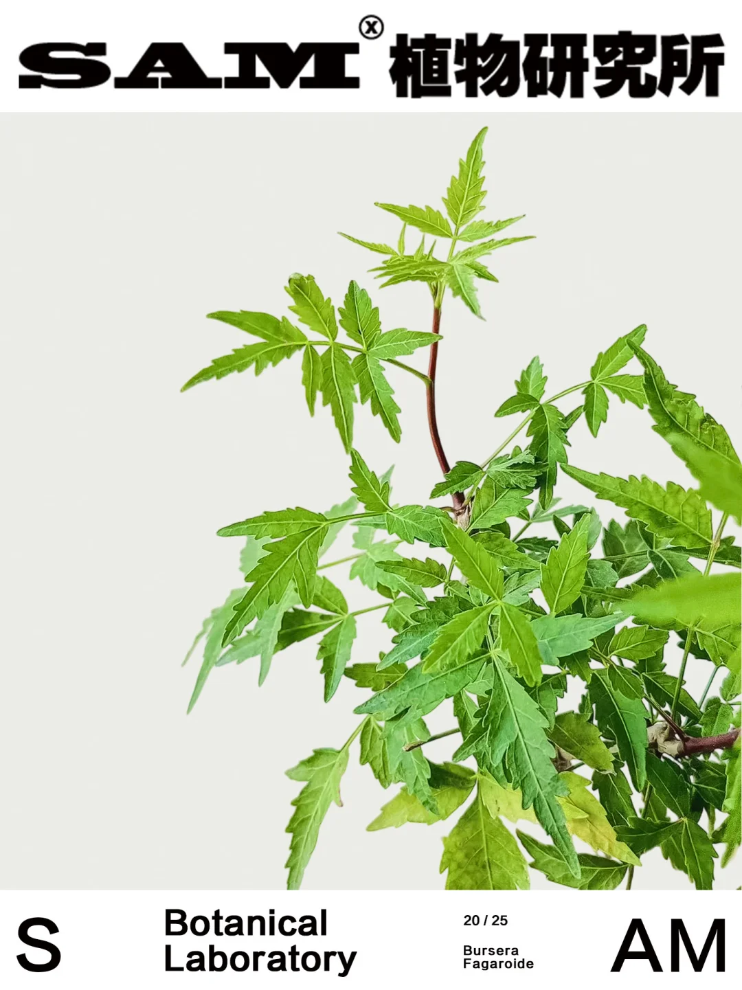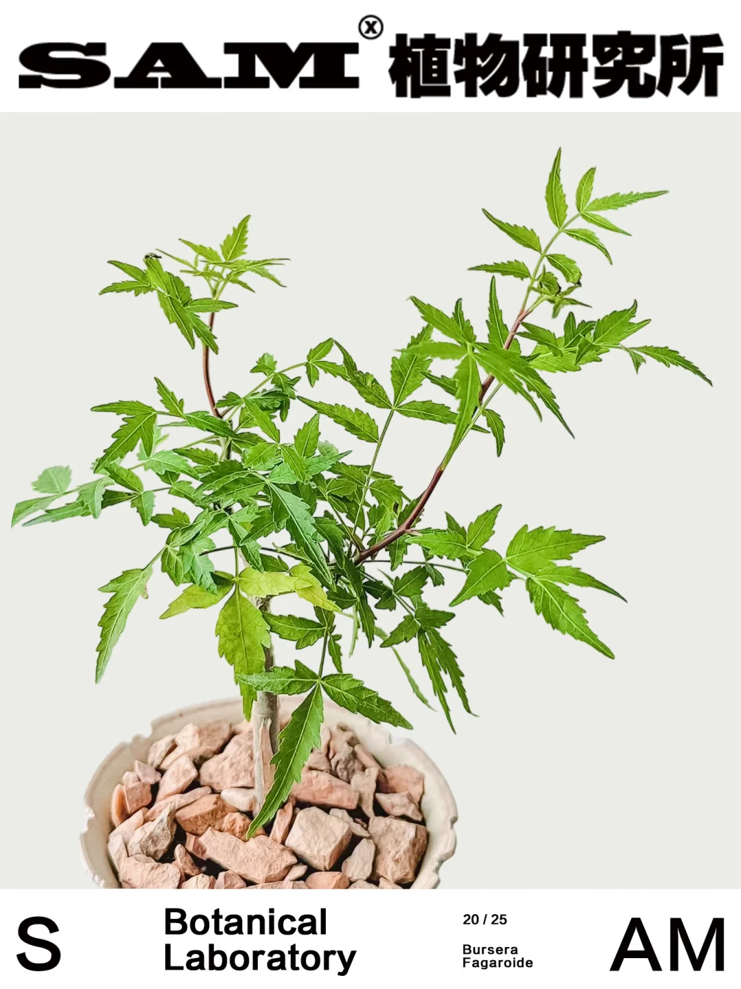 Bursera Fagaroide\n-\n⛰️Origin:裂榄属多分布于美洲热带地区。\n-\n🍃Genus:橄榄科裂榄属多年生常绿乔木或灌木植物。\n-\n🌿Shape:叶形细长,边缘具细锯齿,常深裂成羽状或掌状。汁液含有浓郁芳香,切开枝条或揉搓叶片,会挥发香味。\n-\n💚Tips:之前有安利过常见的芳香橄榄,从名字上就可以体现出它们独有的特点,拥有迷人的芳香汁液。狭叶芳香也同样继承该特点,在叶片上单叶会更细长,边缘锯齿更突出,更具线条感,使得它的叶形有类似于枫叶的“鬼爪”形态,观赏度直接拉满。Bursera 属植物的树脂自古以来就是玛雅与阿兹特克文明的日常用品,既用于宗教祭祀的熏香,也用于药用和驱蚊。狭叶芳香裂榄的气味则带有柑橘、松香与草本的复合调。它们的茎干在经过一定的年份和适当的修剪后,底部会逐渐木质化并膨大,形成圆润粗壮的块根,搭配细长的枝叶,有着“上柔下刚”的反差感。它们耐旱、耐贫瘠,常生长在岩石缝隙与石灰岩土壤中,所以抗性强、易养护。无论你是块根植物爱好者、香草植物收集者,还是对美洲古文明感兴趣的文化探索者,这株\"沙漠中的香氛精灵\"都值得你亲手栽培,感受它带来的独特魅力。\n-\n👨🏻\u200d🌾Caring:\n1、光照:喜明亮光照,适合放在窗边或阳台;夏季烈日时需适度遮阴,避免叶片灼伤。\n2、水肥:生长季节“见干见湿”,透气土壤,夏季可增加浇水频率,不喜长期积水。可辅以缓释肥,促进叶片色彩更鲜明。冬季控水,落叶休眠。\n3、温度:原产热带,不耐寒。冬季温度保持在 10℃ 以上,建议搬至室内保暖。\n-\nSAM植物研究所®,关注我,为生活“家”点心意。\n⛲️工作室日常分享STUDIO\n🚫图文原创,使用请注明出处,侵权必究。\n-\n