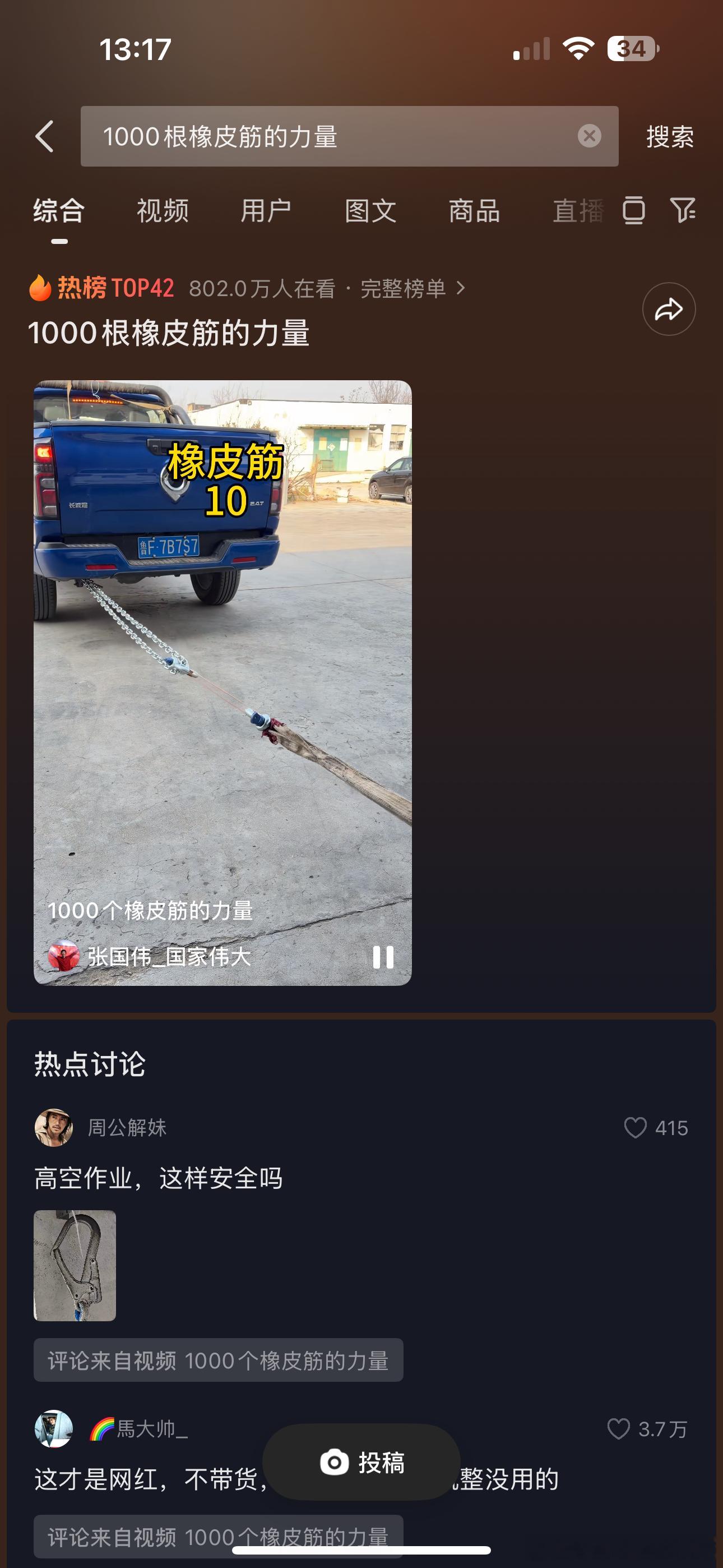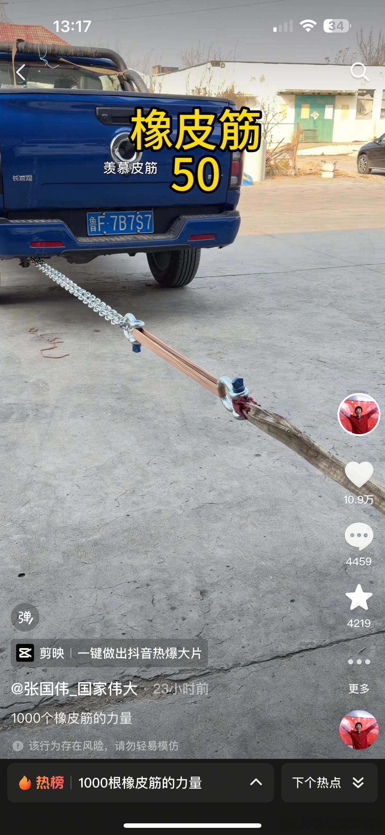 长城炮是一辆好车,我这个皮筋比一般的皮筋粗。我之前做过实验1000千个皮筋完完全全可以钓起一辆车了。