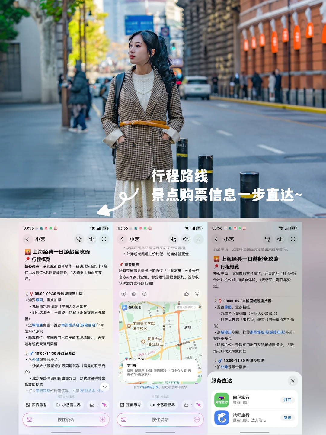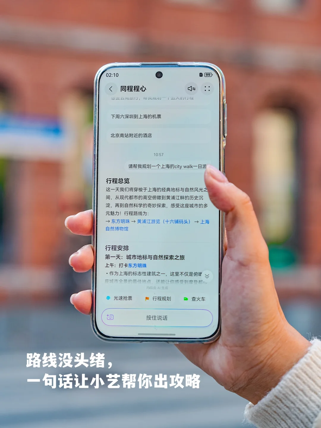 路线没头绪,一句话让小艺帮你出攻略,实用贴士、住宿推荐全给你,连预约提示都安排得明明白白,点击直接跳转同程旅行、马蜂窝、携程购票App,鸿蒙6的集成服务是真的顶![偷笑R]