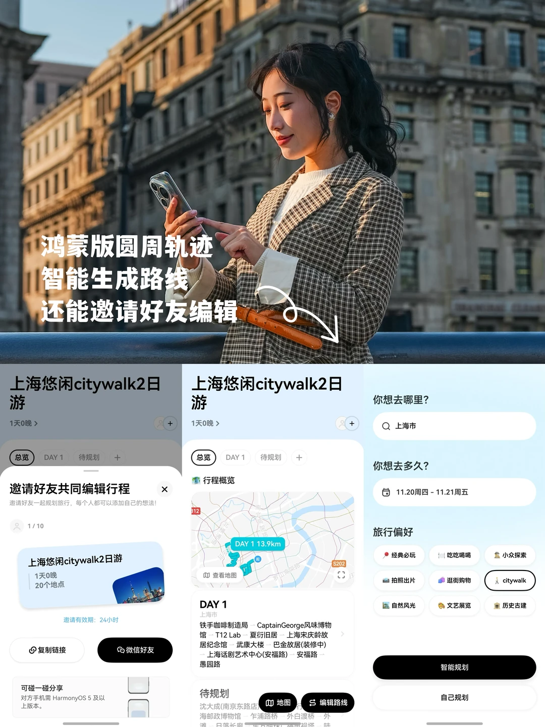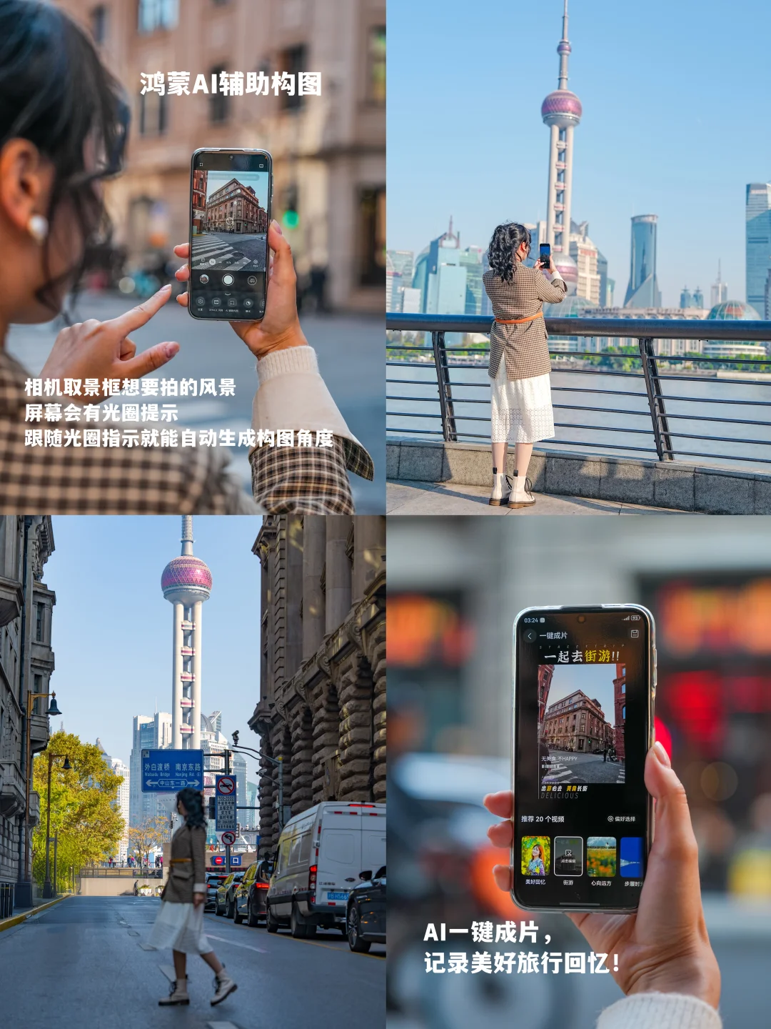 手残党不会拍?[自拍R]鸿蒙AI辅助构图给你支招,相机取景框想要拍的风景,屏幕会有光圈提示,跟随光圈指示就能自动生成构图角度;最后用AI一键成片,不管是旅行记录或是随性自拍等,系统都能根据所选图片进行自定义选择,一日citywalk圆满结束!