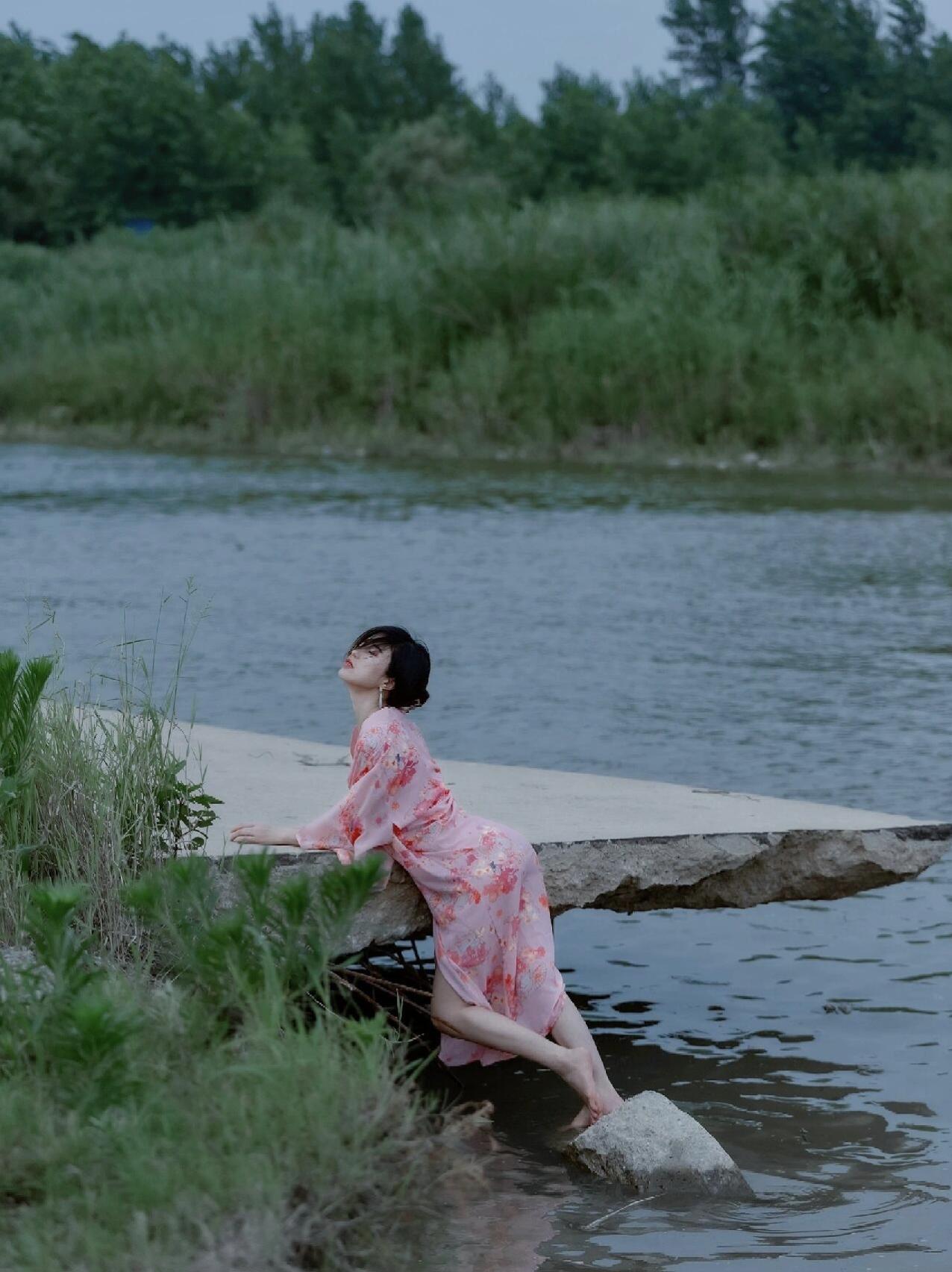 风是透明的河流,带走了所有,却带不走我的沉沦。 = = = = = = = = = = = = = = = = = = = = = = 「情绪氛围」摄影思路: 阴天下的冷调光线自带故事感,选临水断堤+野生植被做场景; 用低饱和粉裙撞冷色背景,肢体舒展放大情绪; 焦点虚焦环境实焦人物,暗调后期压亮部,让情绪在冷柔氛围里自然漫开。