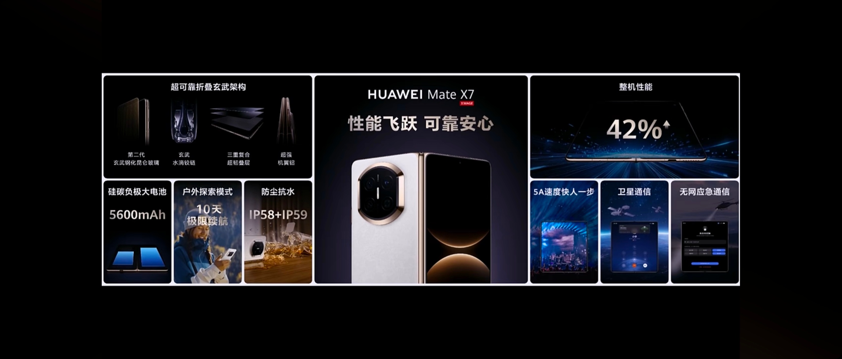 华为 Mate X7 大折叠正式发布,换用新相机 Deco 时空之门设计,整机性能跃升 42%。比肩直板旗舰的影像提升,防水、AI、护眼、续航、可靠全能的大折叠产品。售价 12999 元~ 17999 元