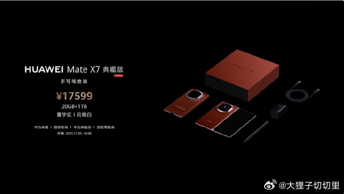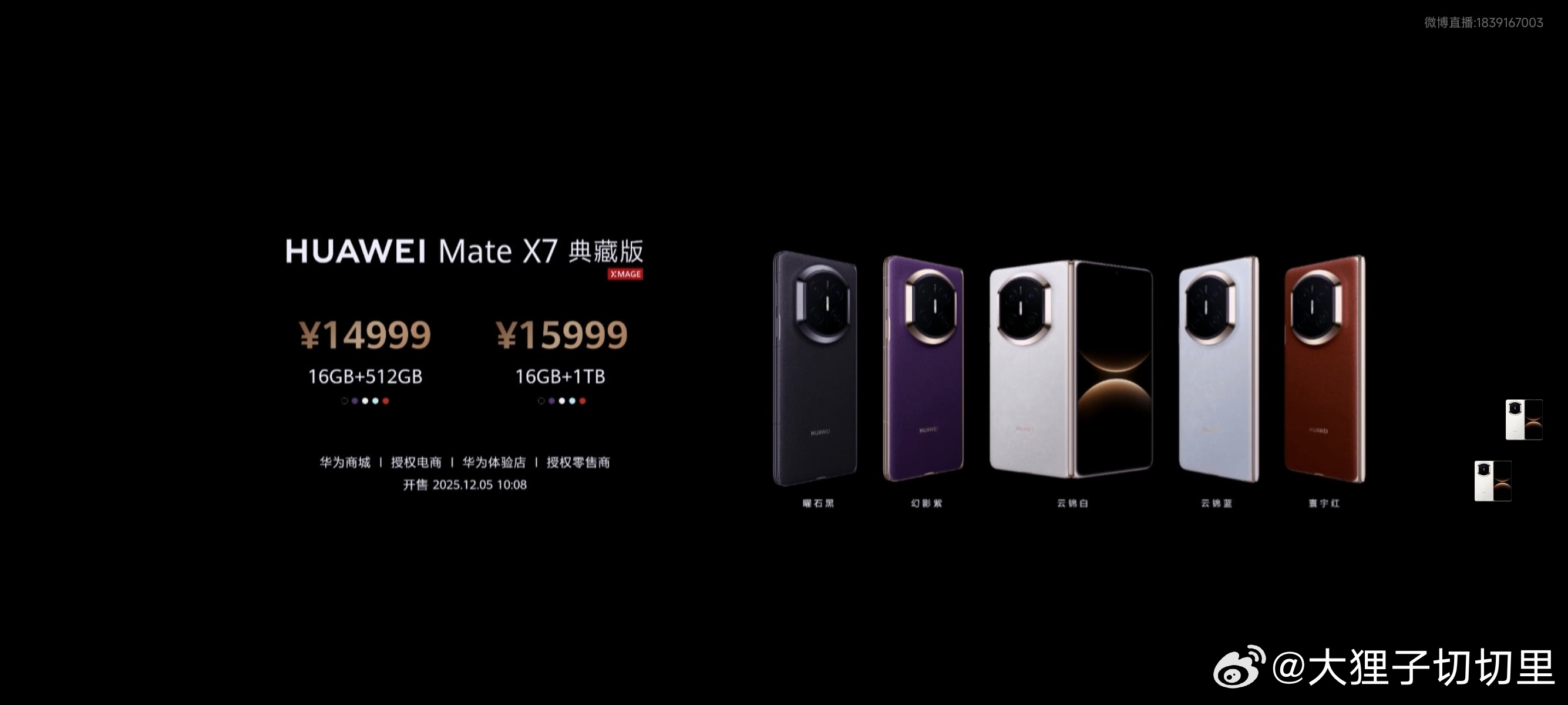 华为Mate X7 12999元起,华为Mate X7 典藏版 14999元起,华为Mate X7 典藏版手写笔套装 17599元, Mate X7居然也有影像套装 1699元,话说蓝色的Mate X7真的很好看啊!