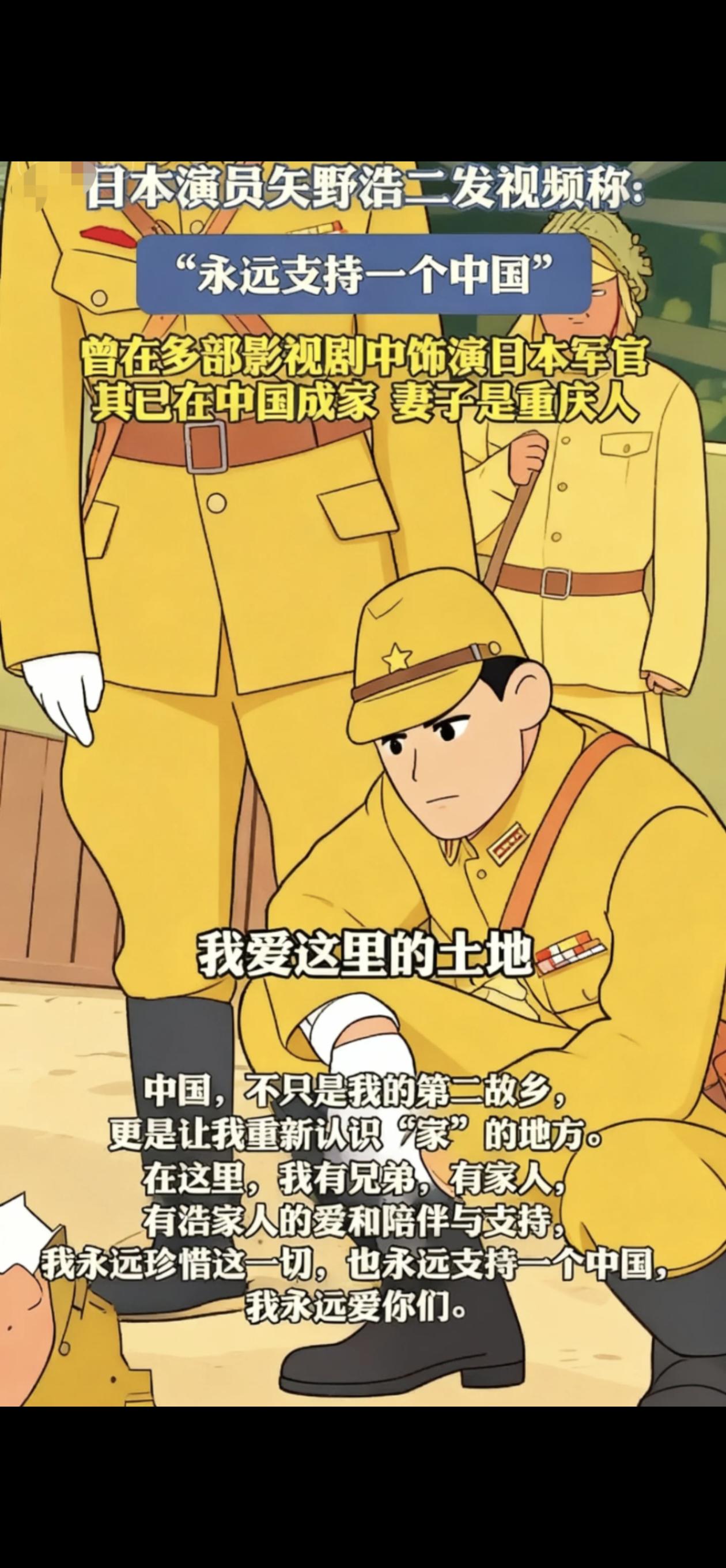 日本演员矢野浩二发视频称:永远支持一个中国,曾在 多部影视剧中饰演日本军官,其已在中国成家妻子是 重庆人