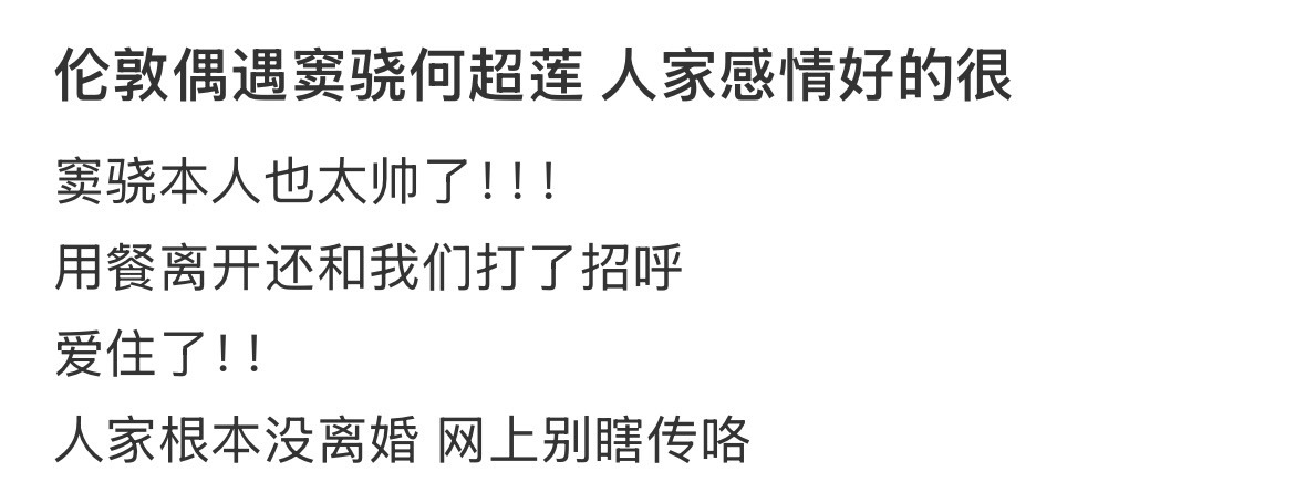 网友伦敦偶遇窦骁何超莲,说两个人看起来感情特别好,窦骁特别帅还打了招呼!看照片两个人也不像感情不和的样子吧…谁说人家离婚了hhhh