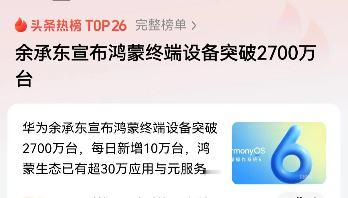 才2700万台吗?卖的手机也不止这点数量吧!继续全民推进鸿蒙系统,中美迟早脱钩,别的系统都靠不住,唯有鸿蒙可靠! 鸿蒙加油!万物互联靠鸿蒙!