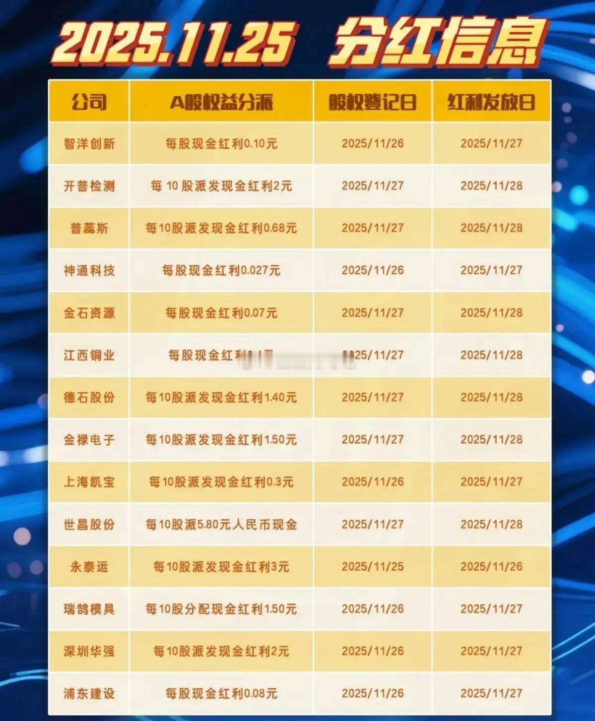 本周最新分红公司梳理!2025年11月25日公布的A股公司分红信息,涵盖工业制造、消费、科技、资源等多个行业。分红形式以“每10股派现金红利”或“每股现金红利”为主,部分公司涉及转增股本。股权登记日集中在11月26-28日,红利发放日多为登记日后1-2个工作日,反映年末企业集中回馈股东的趋势,分红力度与行业现金流稳定性、盈利水平密切相关。个股梳理分析智洋创新:聚焦智能电网运维,提供输配电线路智能监测产品。每股现金红利0.10元,股权登记日11/26,红利发放日11/27,分红体现其稳健盈利与股东回馈意愿。开普检测:主营电力系统检测服务,为新能源并网提供技术认证。每10股派现金红利2元,股权登记日11/27,红利发放日11/28,受益行业高景气实现分红。普蕊斯:专注创新药物临床研究CRO服务,覆盖生物制药全周期。每10股派现金红利0.68元,股权登记日11/27,红利发放日11/28,业绩稳定支撑分红。神通科技:汽车智能座舱部件供应商,产品含智能中控、车载冰箱。每股现金红利0.027元,股权登记日11/26,红利发放日11/27,消费复苏提振业绩。金石资源:国内萤石行业龙头,主营萤石矿开采及氟化工产品。每股现金红利0.07元,股权登记日11/27,红利发放日11/28,资源优势保障分红。江西铜业:大型铜金属矿企,涵盖采选、冶炼及铜箔等深加工。每股现金红利0.4元,股权登记日11/27,红利发放日11/28,周期景气提升分红能力。德石股份:专注石油钻具研发制造,产品用于油气田钻探工程。每10股派现金红利1.40元,股权登记日11/27,红利发放日11/28,能源设备需求驱动分红。金禄电子:印制电路板生产商,重点布局汽车电子、通信领域PCB。每10股派现金红利1.50元,股权登记日11/27,红利发放日11/28,下游需求旺盛支撑分红。上海凯宝:中成药企业,核心产品为痰热清注射液等呼吸类药物。每10股派现金红利0.3元,股权登记日11/26,红利发放日11/27,医药消费刚需保障分红。世昌股份:从事军民两用通信设备及配套部件研发制造。每10股派5.80元现金,股权登记日11/27,红利发放日11/28,高分红凸显盈利质量。永泰运:化工物流供应链服务商,提供危化品仓储、运输一体化服务。每10股派现金红利3元,股权登记日11/25,红利发放日11/26,行业壁垒带来高分红。瑞鹄模具:汽车模具及智能装备供应商,服务新能源整车厂。每10股分配现金红利1.50元,股权登记日11/26,红利发放日11/27,新能源转型驱动分红。深圳华强:电子元器件分销龙头,构建全球元器件数据库及交易平台。每10股派现金红利2元,股权登记日11/26,红利发放日11/27,平台规模效应支撑分红。浦东建设:上海区域基建龙头,主营道路、桥梁等工程建设及养护。每股现金红利0.08元,股权登记日11/26,红利发放日11/27,区域订单保障稳定分红。ST炼石:主营有色金属冶炼,涉及航空发动机高温合金材料。每10股转增5.99股,股权登记日11/27,红利发放日11/28,转增体现资本扩张意图。鱼跃医疗:家用医疗器械龙头,核心产品含制氧机、血压计等。每10股派1.80元,股权登记日12/1,红利发放日12/2,健康消费复苏提振分红。纽泰格:汽车零部件供应商,专注于悬架、转向系统精密部件。每10股派现金红利0.55元,股权登记日11/28,红利发放日12/1,细分领域技术优势支撑分红。好利科技:电路保护元器件制造商,产品用于电力、通信等领域。每10股派现金红利0.28元,股权登记日12/1,红利发放日12/2,工业升级需求驱动分红。立高食品:烘焙食品原料及冷冻烘焙产品生产商。每10股派现金红利2元,股权登记日12/1,红利发放日12/2,消费复苏带动业绩与分红。海希通讯:工业无线遥控设备制造商,服务工程机械、港口自动化。每10股派0.50元,股权登记日11/28,红利发放日12/1,细分赛道龙头保障分红。开特股份:汽车电子控制系统供应商,产品含传感器、控制器。每10股派1.70元,股权登记日12/1,红利发放日12/2,汽车智能化趋势提升分红。总结本次分红涵盖工业、消费、科技、资源等多领域,分红力度与行业属性高度相关:消费、科技类公司分红稳定;资源、制造类公司随周期景气提升分红;金融、基建类公司依托现金流持续回馈。股权登记与发放节奏高效,反映企业治理透明度提升。投资需结合行业周期、公司盈利质量辩证看待分红,警惕“高分红+弱基本面”标的,优选赛道景气与业绩确定性强的方向。本文涉及资讯、数据等内容来自网络公共信息,仅供参考,不构成投资建议!