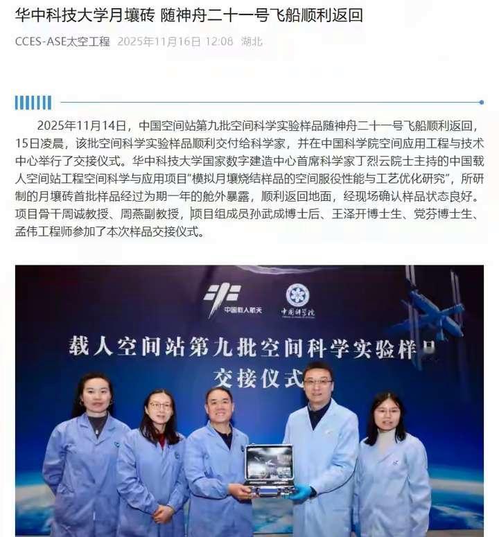 11月26日,据央视新闻客户端报道,经过一年的舱外暴露试验后,首批用于月面建造研究的“月球砖”样品,日前随着神舟21号载人飞船顺利返回地球。 科研人员经过开盖检测,确定首批“月球砖”样品状态良好。 此次返回编号尺5样品单元共34块“月球砖”,总重100克。刚刚经历一年太空辅谢。大温差等极端环境考验,按照规定进行3年“月球砖”测试,为建立起自己的月球基站,提前开始准备着,利用3D打印机在月球上打印出月球砖,作为月球基地建筑物专用材料。[赞][赞][赞][赞][赞][赞]