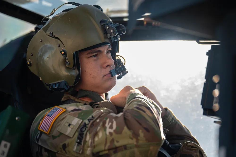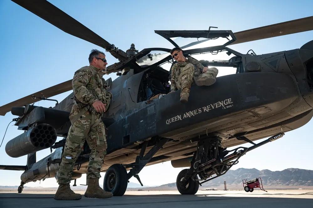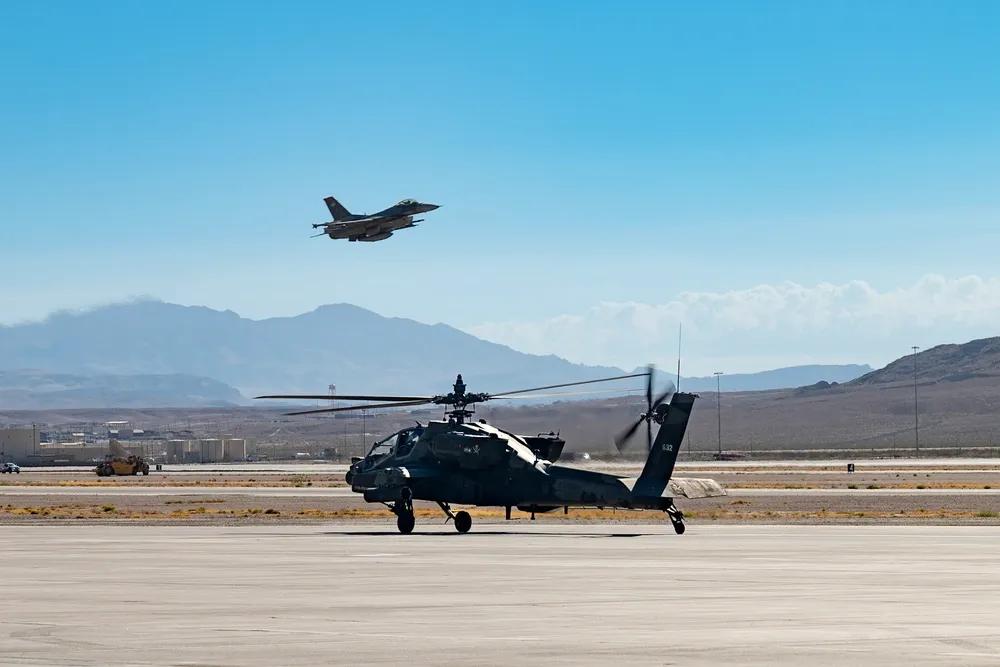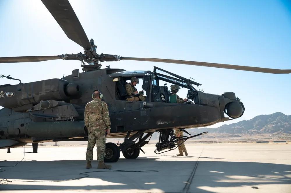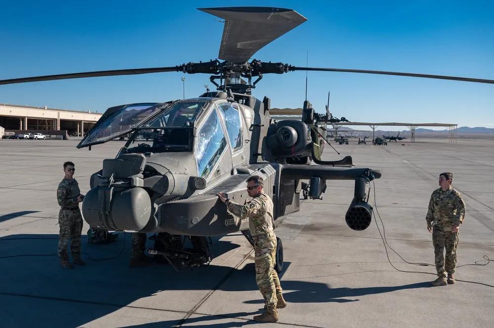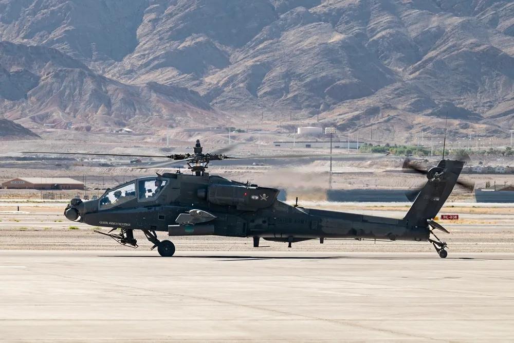 8月23日,一架AH-64D阿帕奇攻击直升机正在准备执行支援美国空军武器学校第66武器中队的任务。他们的支援使A-10C战机和联合终端攻击控制(JTAC)武器学校的学员能够在复杂任务中指挥固定翼和旋翼飞机的实弹使用。