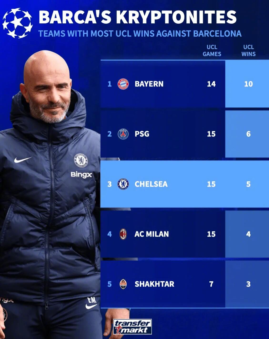 德转在赛后更新了欧冠联赛(即1992改制后的欧冠)中击败巴塞罗那球队的次数排行榜。具体榜单如下:1.拜仁慕尼黑 14次相遇10胜2.巴黎圣日耳曼 15次相遇6胜3.切尔西 15次相遇5胜4.AC米兰 15次相遇4胜5.顿涅茨克矿工 7次相遇3胜