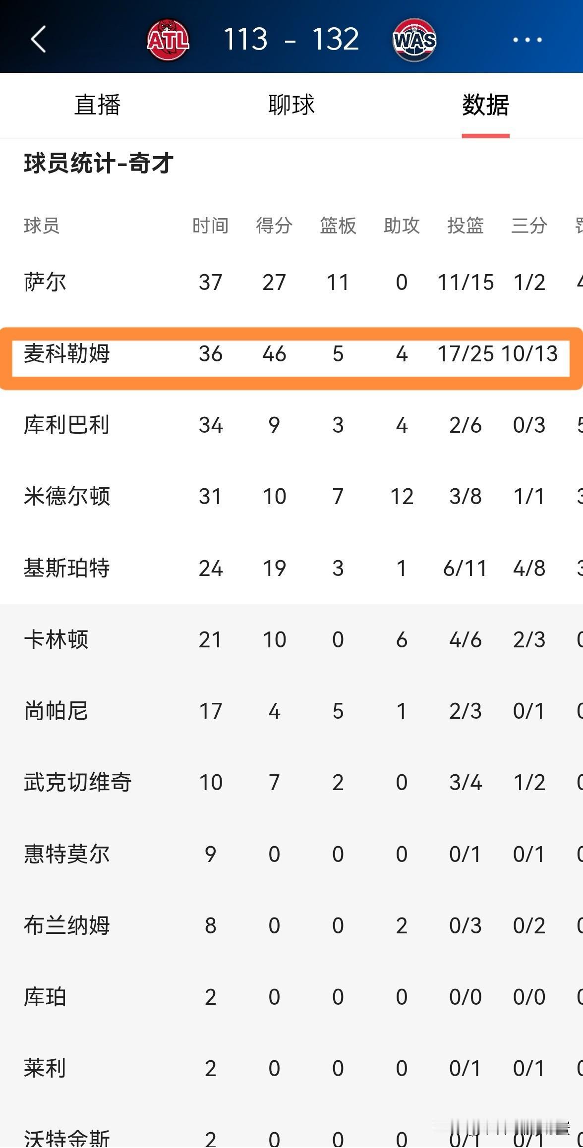 奇才老将CJ-麦科勒姆真是彻底的杀疯了!在今天奇才主场以132:113大胜老鹰的比赛中,麦科勒姆打出了超级巨星的表现。 整场比赛下来,麦科勒姆首发出战36分钟,投篮25中17,其中三分球13中10、罚球4中2疯狂的砍下46分5篮板4助攻1抢断,他的场上正负值为+19。 本场比赛麦科勒姆在进攻端给人的感觉就是无法阻挡,得分对于手感火热的麦科勒姆来说犹如探囊取物一般。