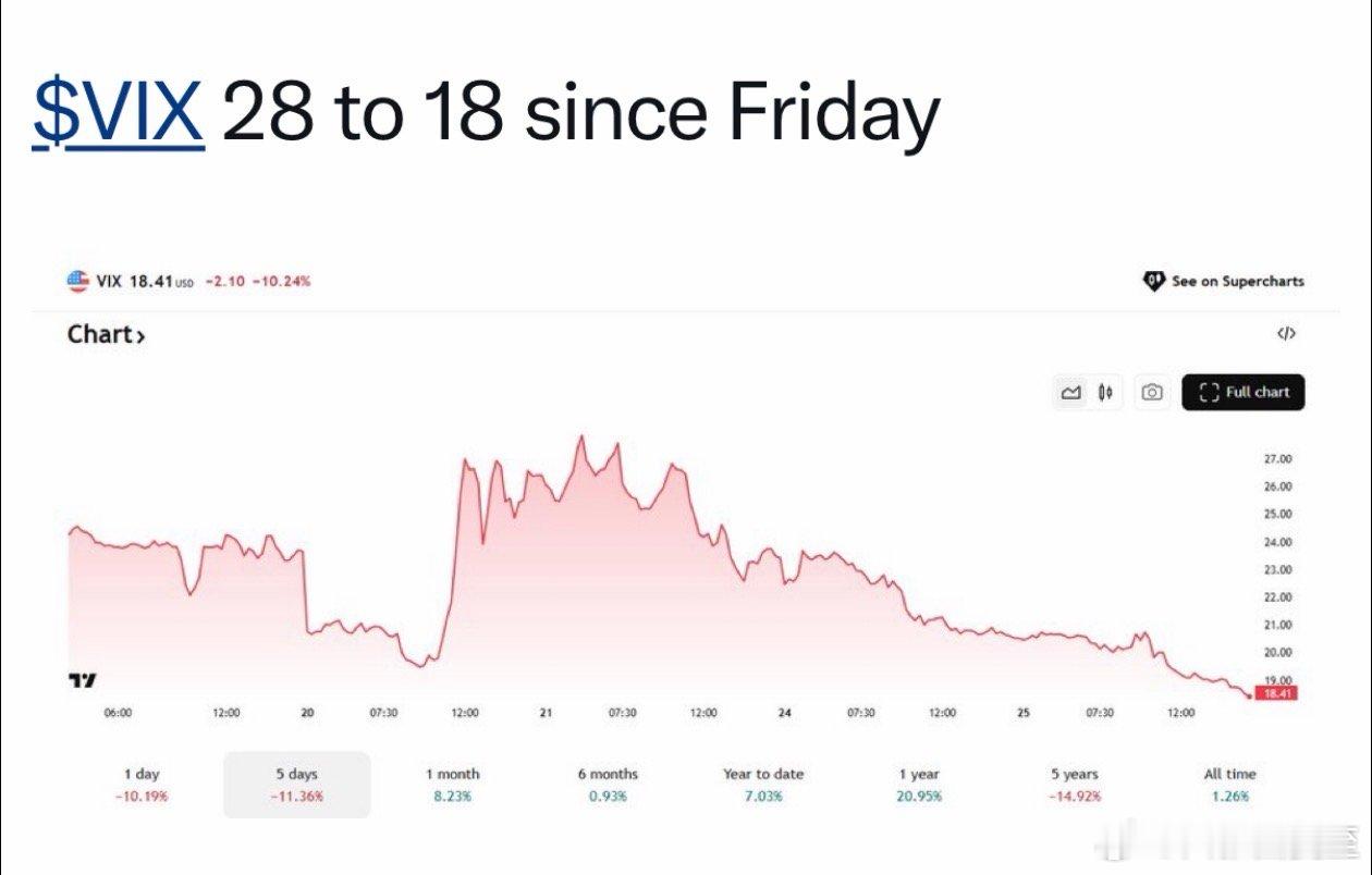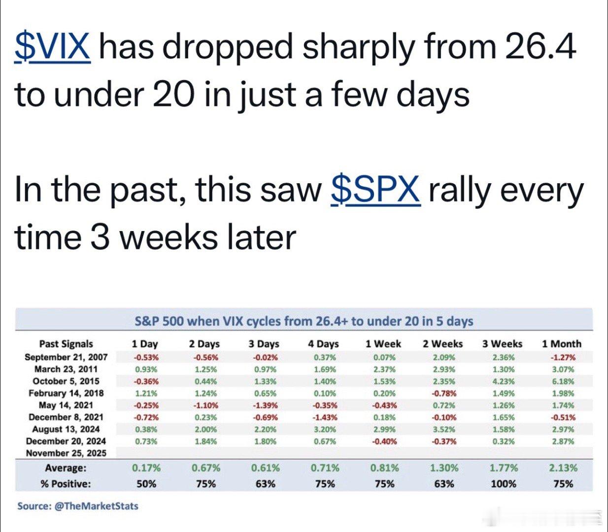 美股“恐慌指数”,连续三个交易日下降⬇️历史上,出现同样情况时,三周后,标普500都在涨,平均📈1.77%