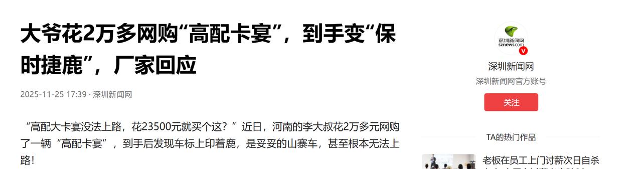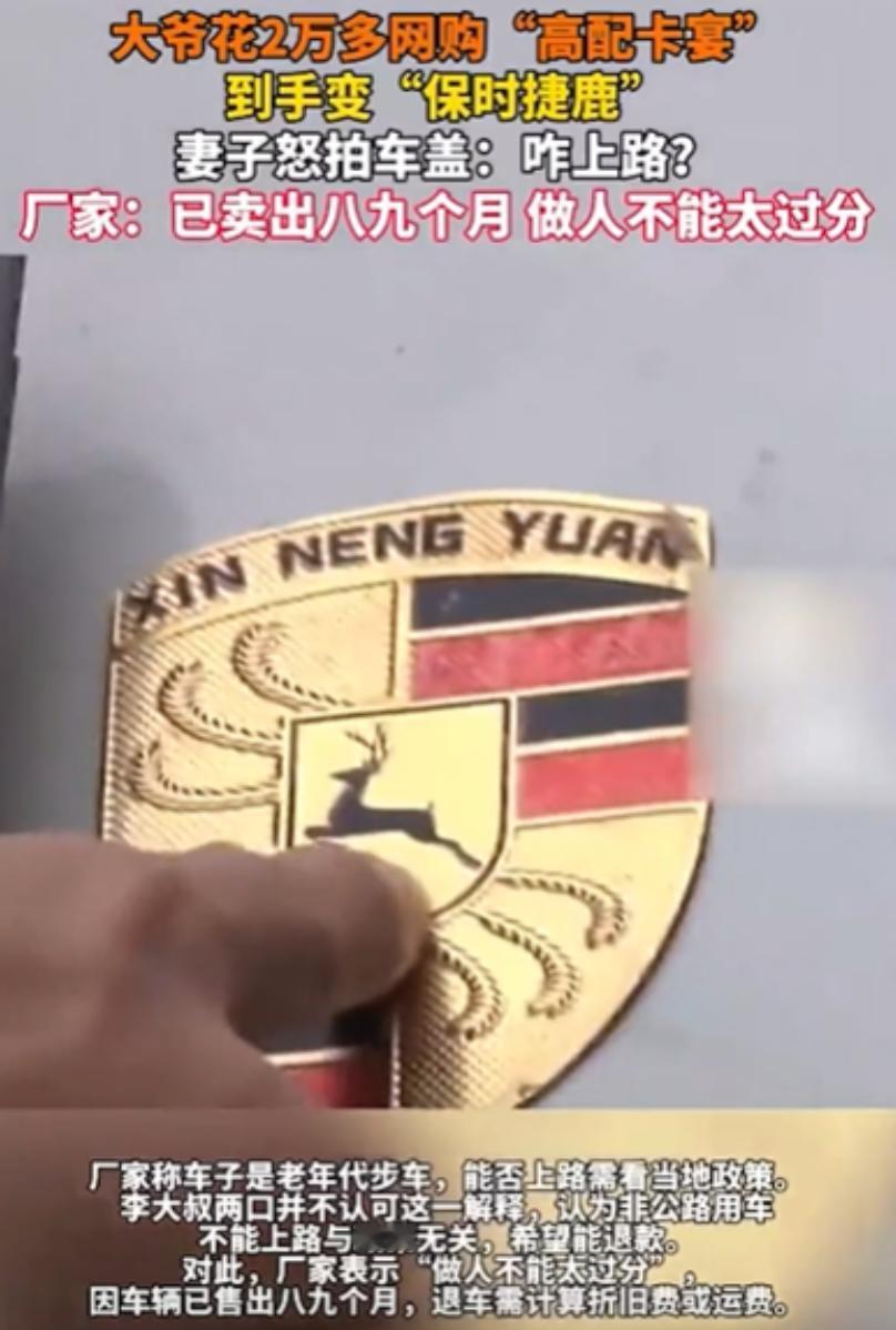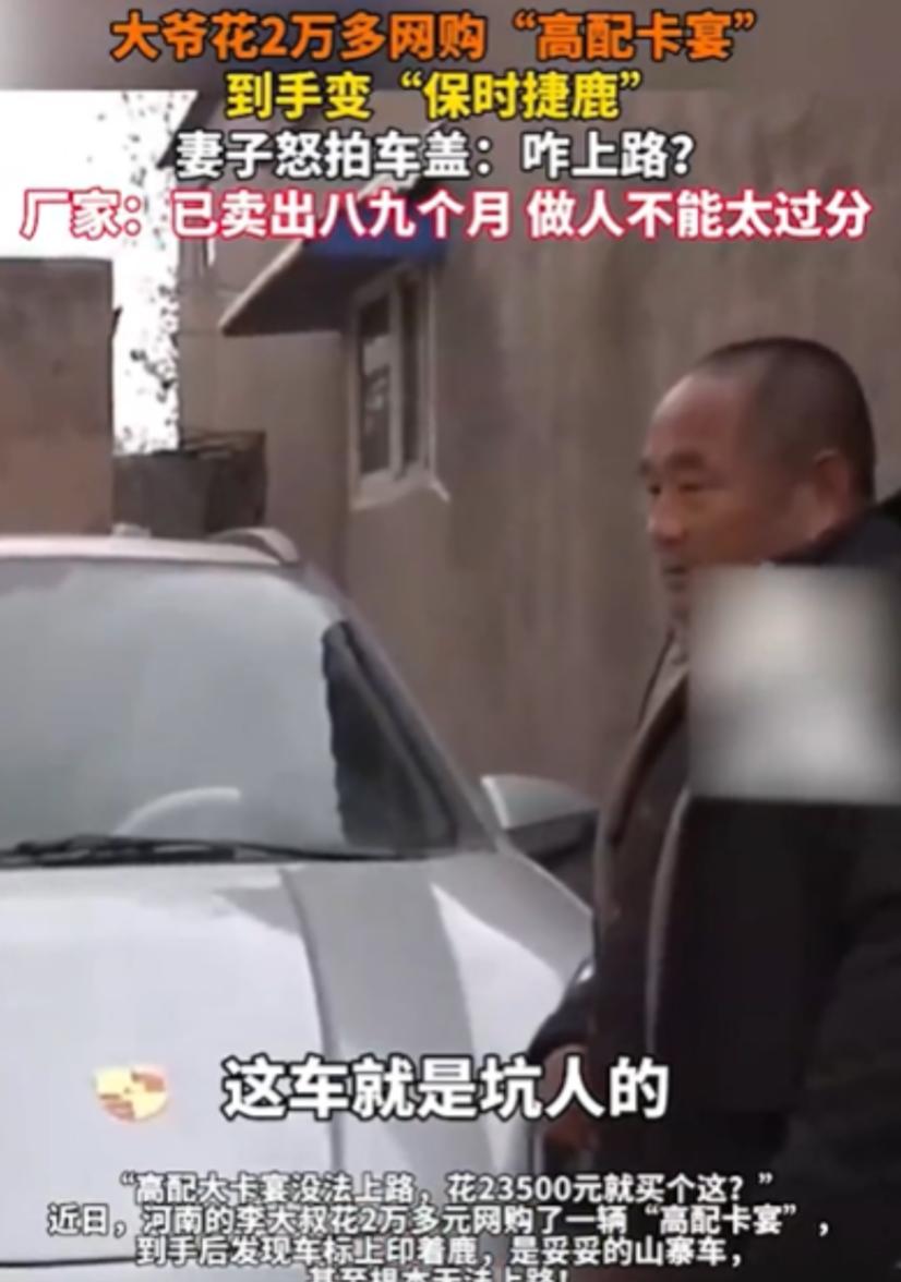贪小便宜吃大亏!河南一大爷花23000元网购“高配卡宴”,结果到手之后,发现车标上印着鹿,“保时捷”也变成了“保时捷鹿”,是妥妥的山赛车,而且,根本不能上路,希望厂家能退款,厂家喊冤:已卖出八九个月,做人不能太过分。 李大爷今年六十多,平时最大的爱好就是没事刷手机购物软件,总盼着能淘到性价比超高的好东西,他常跟身边人说,过日子就得会算计,能省一分是一分。 可他这份 “算计”,有时候也带着点盲目,只要看到价格诱人的东西,就容易忽略其他关键问题,这天李大爷像往常一样刷着手机,一条弹窗广告突然跳了出来 “高配卡宴清仓处理,仅售 23000 元”。 看到这行字,李大爷眼睛一下子亮了,心里咯噔一下,保时捷卡宴啊,那可是响当当的豪车,平时在马路上看到都得多看两眼,就算是二手的也得几十万起步,现在居然只要两万多?这不是天上掉馅饼吗? 他越看越心动,广告上的车子图片流光溢彩,内饰也显得豪华气派,完全看不出任何问题,李大爷当时脑子里全是 “捡着大便宜了” 的念头,压根没想着跟儿女商量,也没考虑过这么低的价格会不会有猫腻,更没找懂车的年轻人问问情况。 他只觉得这么好的机会可遇不可求,要是错过了,以后再没这么划算的事儿了,于是他没多犹豫,当场就点了下单,把自己省吃俭用攒下来的 23000 块钱转了出去,满心欢喜地等着自己的 “豪车” 送货上门,还琢磨着等车子到了,得让老伙计们都看看,自己也开上豪车了。 盼了好几天终于到了收货的日子,李大爷特意叫上邻居,兴冲冲地去物流点取车,可当车子被卸下来的那一刻,李大爷脸上的笑容一下子就僵住了,旁边的邻居也看傻了眼,眼前的车子跟广告上的样子简直天差地别。 先说外观车身线条生硬,做工粗糙得没法看,车门缝隙大得能塞进手指头,用手一按塑料外壳,居然直接就软塌塌地陷了下去,完全没有豪车该有的质感。 更让李大爷没法接受的是车标和车名,广告上明明是保时捷的骏马标,可这车子的车标居然是一只鹿,看着格外滑稽,再看车身上的标识,原本该是 “PORSCHE” 的地方,硬生生变成了 “保时捷鹿”,不伦不类的明眼人一看就知道是仿冒的山赛车。 李大爷心里咯噔一下,赶紧找出随车附带的合格证,打开一看上面 “非公路用车” 几个字格外刺眼,这一下李大爷彻底懵了,原来这车子根本就不能合法上路,连牌照都没法上,之前卖家在广告里说的 “手续齐全、合法上路” 全是骗人的鬼话。 这时候李大爷才回过神来自己是上当了,那 23000 块钱花得彻头彻尾冤枉,这哪里是什么高配卡宴,分明就是个拼装的劣质山赛车,只能放在院子里当摆设,连出门开都不行。 想到自己省吃俭用攒下来的钱打了水漂,李大爷又气又急,饭都吃不下,他赶紧试着联系当初的卖家,可之前还热情主动的客服,现在要么是忙音,要么接了电话一听是他直接就挂断了,发过去的消息更是石沉大海,再也没有回音。 没办法李大爷只能跟儿女说了这事儿,儿女一听也急了,赶紧帮着找媒体求助,想通过舆论压力让厂家给个说法,好不容易在媒体的帮助下,他们联系上了生产这款车子的厂家。 可让人没想到的是,厂家的态度不仅强硬还倒打一耙,面对李大爷提出的全额退款要求,厂家负责人居然说,车子都卖出八九个月了,现在才来要退款做人不能太过分。 这话让李大爷和儿女都气不打一处来,这车子本身就是假冒伪劣的山赛车,根本不符合上路标准,卖家当初就是靠着虚假宣传骗消费者下单,这明明是商家的错,怎么反倒成了消费者过分了? 后来在媒体的进一步追问下,大家才知道这款所谓的 “高配卡宴”,其实是没有正规厂名、厂址,也没有合格上路证明的 “三无产品”,就是厂家专门冲着那些想贪小便宜的人生产的仿冒品。 舆论监督和法律的双重压力下,之前还态度强硬的厂家,终于松了口同意给李大爷全额退款,钱虽然拿回来了,但李大爷心里别提多憋屈了,这事儿也给周围的人敲响了警钟。 天上不会掉馅饼,就算真有 “漏”,也轮不到咱们轻易捡到。踏踏实实花钱,买靠谱的东西,才不会吃这种 “贪小便宜吃大亏” 的亏,毕竟一分钱一分货的道理,从来都没错过。 (信息来源:深圳新闻网——大爷花2万多网购“高配卡宴”,到手变“保时捷鹿”,厂家回应)