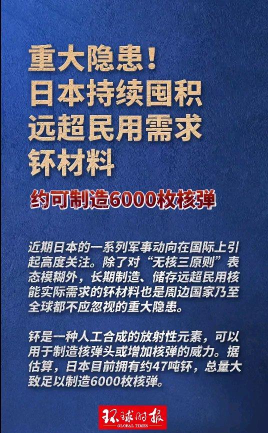 一直怀疑日本早就暗中拥有核弹…… 10多前还只拥有几百斤左右的制核武的核原料,现在已拥有约47吨钚,总量大致足以制造6000枚核弹。 联合国原子能机构是只盯着伊朗吗?对日本为什么视而不见听而不闻? 不宣而战是日本战争惯例,根本没法预警。以往日本鬼鬼祟祟的不知道搞了多少名堂,现在这么高调,有可能已经为战争做好了准备,随时可能再次不宣而战。 如果继续装作看不到,不到病倒前一夜,绝不会上医院,那我们会后悔的。 我们要学俄罗斯和以色列,该出手时必出手,否则就会威胁到国家生存。