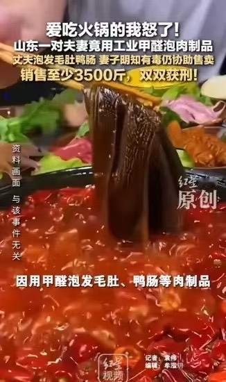 “太可怕了!”山东东营,一男子为了让肉制品卖相更好,不易变质,竟然使用工业甲醛泡发食材,他的妻子虽然知道内情,但仍帮助售卖,4年来,至少卖出3500斤“毒食材”,最终双双获刑。网友:爱吃火锅的我怒了! 这对夫妻在东营区经营一个肉制品摊位,李某甲发现夏天时品相不好的牛百叶、毛肚很难卖,便动起了歪脑筋。他买来工业用甲醛,专门泡发那些看起来不新鲜的食材。经过甲醛处理的肉制品变得体积肥大、色泽亮白,即使高温天气也不易腐败。 他的妻子朱某每天在摊位上销售这些“美容”后的食材。她清楚丈夫对肉制品做了手脚,却没有制止。四年里,这些被甲醛浸泡的毒牛百叶、毛肚、鸭肠等,源源不断地流向消费者的餐桌。直到公安机关在工作中发现线索,他们的行为才被制止。 甲醛是明确的致癌物质,长期摄入会对人体呼吸道、消化道造成严重损伤。用甲醛处理食品是严重违法行为,这对夫妻的行为是对消费者健康的极端漠视。 如何辨别甲醛泡发的食物有三种简单方法:一看颜色,过于雪白、体积异常肥大的要警惕;二闻气味,带有刺激性异味的不要买;三摸手感,一握就碎的很可能有问题。购买这类食品时,不要被过于“光鲜”的外表迷惑。 此案中夫妻二人均被判刑并处罚金,显示了法律对食品安全犯罪的零容忍,食品安全是底线,任何以损害消费者健康为代价获取利益的行为,终将受到严惩。 各位读者你们怎么看?欢迎在评论区讨论。