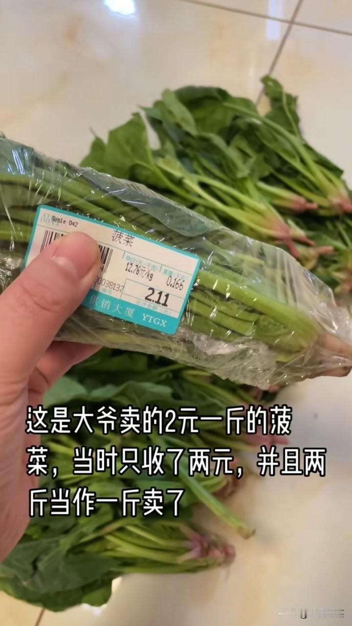 河北唐山一大姐在大爷那买了1斤菠菜,2块钱一斤,大姐称了1斤,但拎着很沉,不像是1斤,大姐回到家一称,足足有2斤重。 大姐回去找大爷,想把多出来1斤的2块钱补给他,大爷连忙摆手说,不要了。 大爷的称是公斤称,单价那里设置的是2元,但是是一公斤2元,大爷错以为是1斤2元。 大姐在超市买的2.11元的菠菜,只有一小把,0.166千克,也就是3两,超市卖的菠菜大概是6元一斤,而摆摊的大爷只买2元一斤。 令人惊讶的是,大姐去找大爷补差价的时候,大爷还不知道自己的称设置的是2元一公斤,也就是说,之前来买菠菜的顾客没有察觉到不对劲,或者是察觉到了也没人来找大爷退差价,大家还是很喜欢占便宜的[打脸],大爷亏大了!