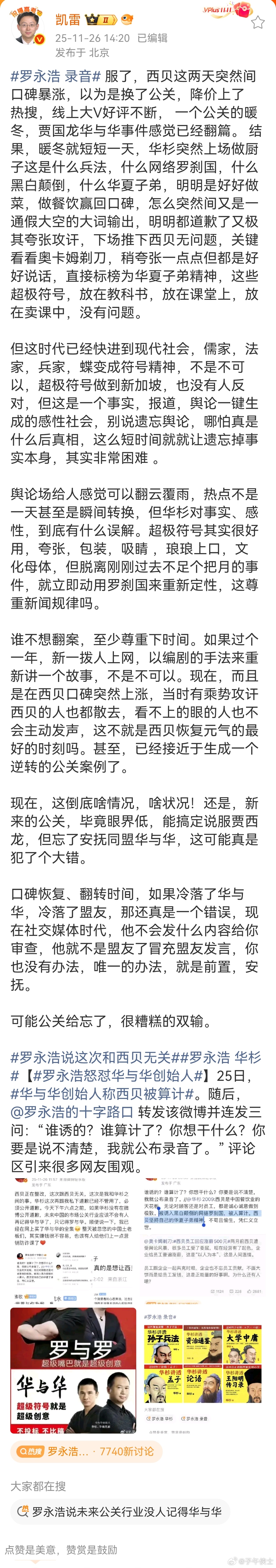 凯总,你是咋回事儿啊,差不多行了。人罗永浩都已经说了,说这次,这是他和华彬之间的私怨,与西贝无关,你就非得拉着西贝一块打?西贝事件以来,别的大V最多也就是起个哄,凑个热闹,你可是一直下重手,欲置西贝于死地啊,这得多大仇多大恨啊?我没说西贝就完美,但再怎么说,人家也解决了近两万人的就业问题,给国家缴的税,相必也不在少数,没你凯总这个玩嘴皮子的,对国家和社会贡献大?西贝死透了,你就爽了,头发就长出来了,也不戴假发了?做人要有点善念,要给人留活路,要给人留余地,我说得有没有道理?再说了,纵观事件全过程,西贝除了初期公关手段愚蠢,让人诟病,它错在哪儿了?它违法了,还是违规了?西贝事件,无非就是对预制菜的认知和定义,民间和官方有差异,由此造成的舆论争议,还有什么?一个既不违法,也不违规的,有着近两万员工的大型连锁餐饮,你们就非得往死里整?党和政府说要保护民营企业的合法权益,前不久,又特别强调要振兴实体经济,请问,西贝这样的合法经营的民营企业,在不在保护之列,西贝是不是实体经济?劝凯总一句:做人留一线,心里别太阴暗,太扭曲。别让路人都看不过眼。