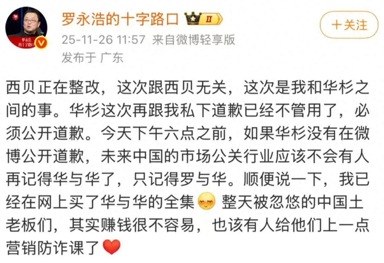 营销界的笑柄——华与华大概率不会在六点前给老罗道歉了! 狗 改不了 吃 屎,9月份刚给老罗私下道歉,11月又挑事,真是记吃不记打的货! 成年人的游戏,在公开叫板后要么硬抗,要么认怂! 华与华在江湖上也有一号,就这么认怂道歉,以后还怎么在江湖上混啊?!事关“尊严”“荣辱”,退一步万劫不复,这个歉如何能道呢?! 看热闹不嫌事大!就是可惜西贝6000万的公关费还不如喂狗,也能博得一个善待动物的美名! 违背了营销初心,有点成就就不知道天高地厚,沦为金钱的“奴隶”!这就是细节见人品! 一、专业能力难评论 9月,西贝在遭到老罗吐槽后,华杉在微博表示:这不是危机公关,因为根本就没有危机。是贾国龙怒了,要硬杠网络黑嘴。 嗯,这不是在救火,而是在拱火。结果大家都看到了现在西贝的下场!你就说,西贝的6000万亏不亏?! 二、见钱眼开 好事者翻出2024年的采访视频:华杉说第一次与贾国龙见面,并不认可其观点,“但是看在钱的份上没跟他争论”。 至于西贝后厨的事,就不用多说了吧!——狼狈为奸,共同欺骗消费者! 嗯,向钱看,还剩下多少良知,还有没有营销伦理底线呢?! 华与华的脑回路不是正常人能理解的! 静等吃瓜! 西贝翻车 西贝公关 西贝公关灾难 老罗西贝大战
