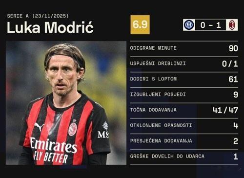 莫德里奇在对阵国际米兰的比赛中踢满全场,Sofascore给他打出了6.9分,让我们看看他在本场比赛的关键数据:出场时间:90'过人(成功):1(0)触球:61丢失球权:9传球(成功):47(41)解围:4拦截:2抢断:1莫德里奇ac米兰