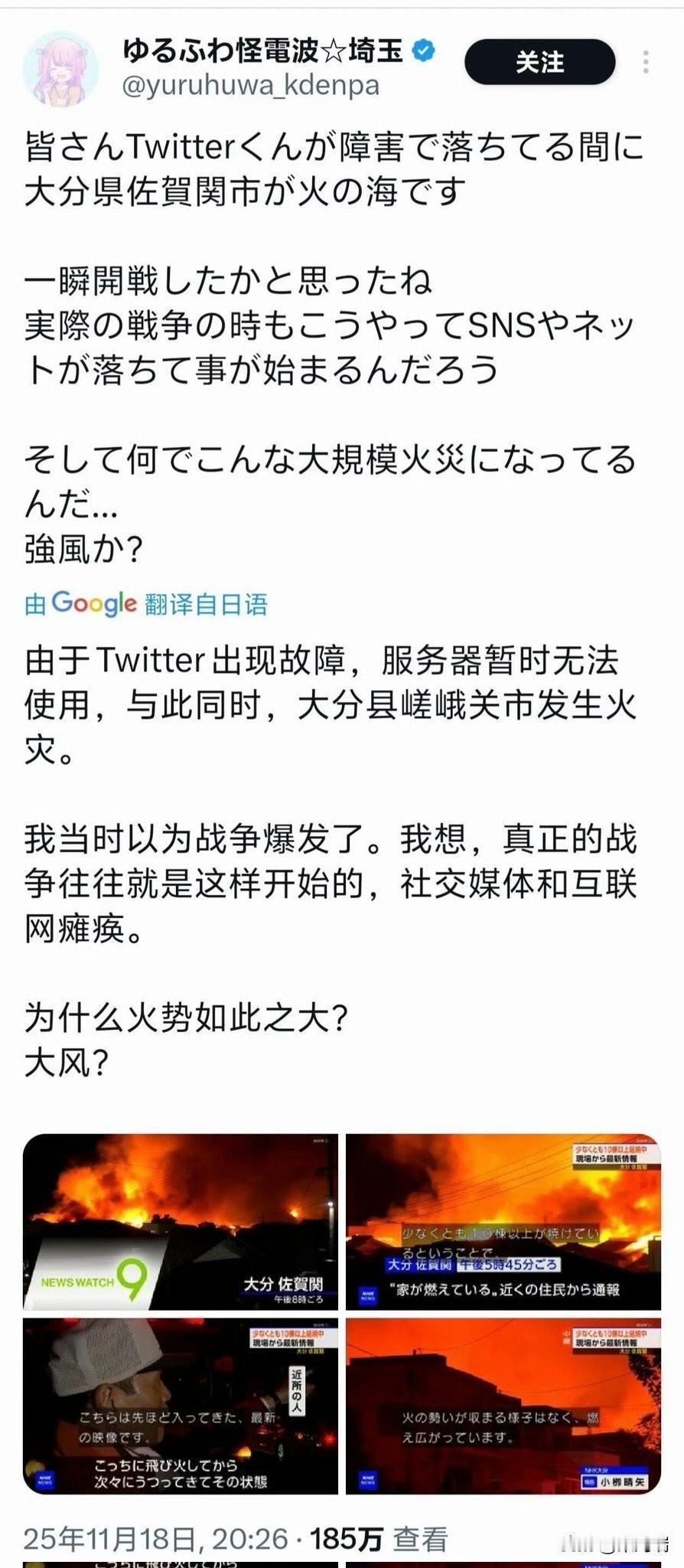 日本大分县大分市佐贺关地区于当地时间11月18日下午发生大规模火灾,火势持续多日,造成严重损失。 恰逢推特发生故障无法登录,大批日本人以为中国打过来了,吓疯了!
