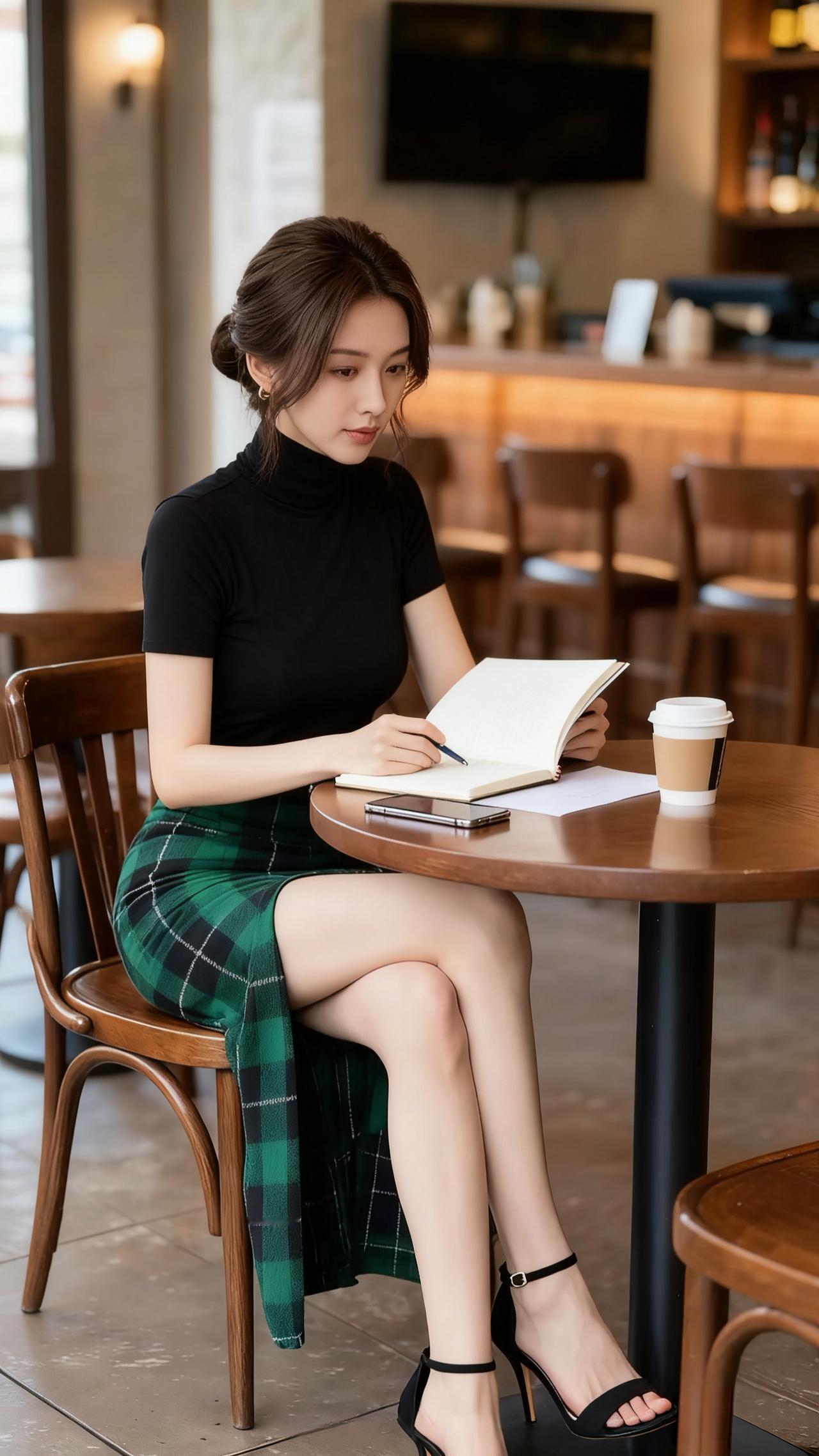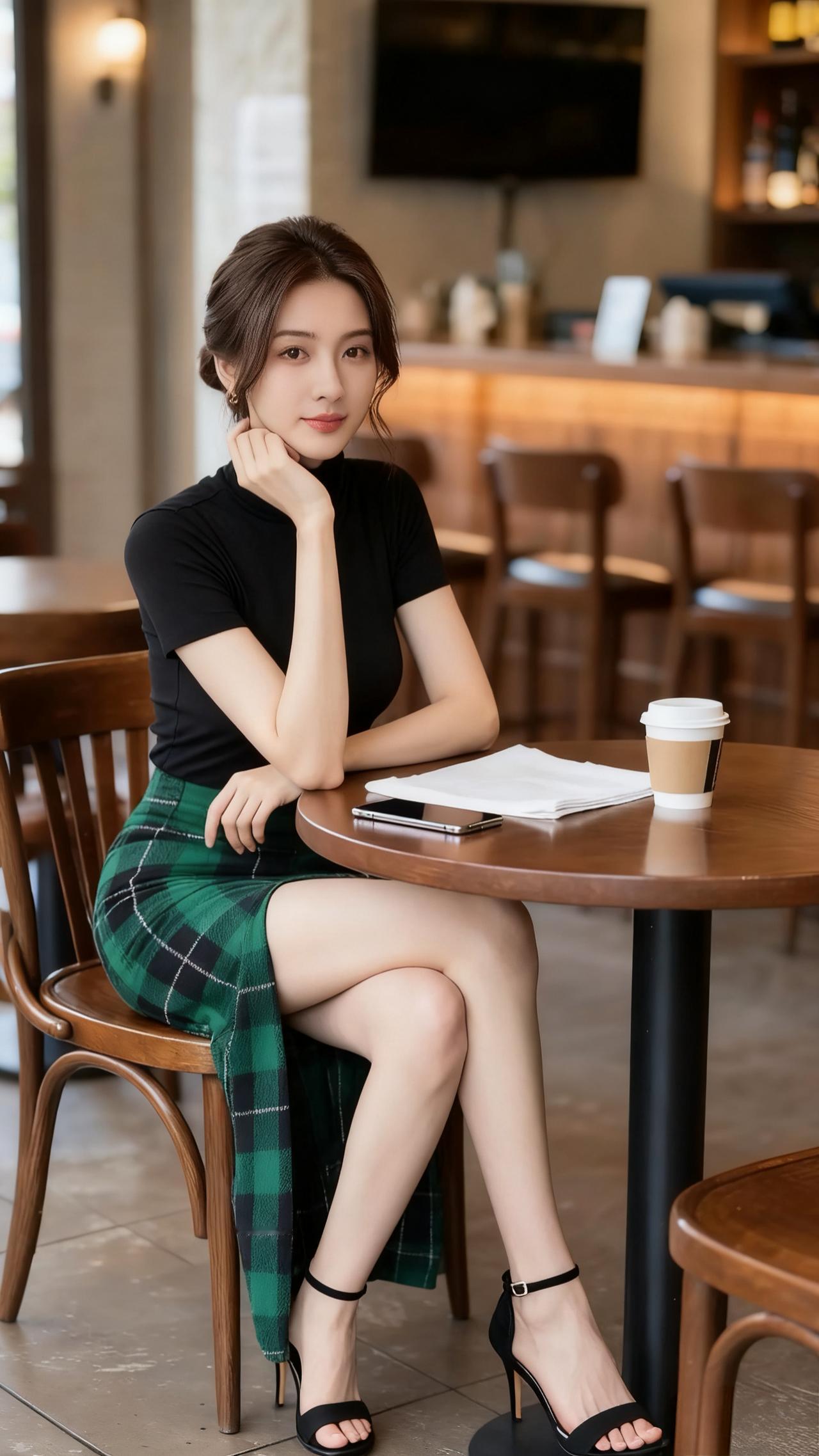 黑色紧身半袖打底衫icon,绿色方格开叉长裙icon,令人看着非常清新靓丽有气质。黑色的露趾高跟凉鞋,令腿部线条显得修长匀称!整体造型非常知性优雅,青春阳光!