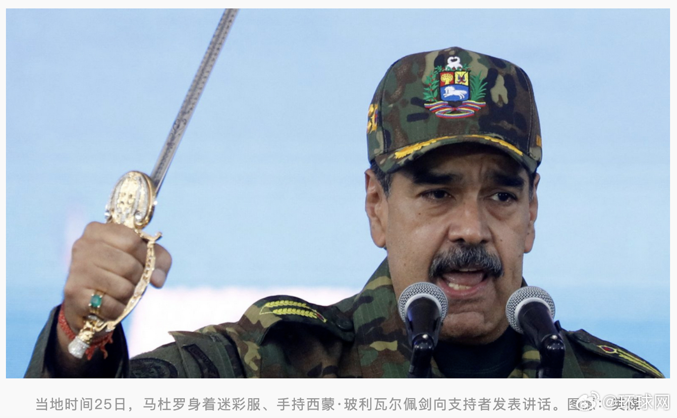 【外媒:马杜罗持剑誓言“坚决抵御帝国主义威胁和侵略”】据路透社、英国天空新闻网报道,当地时间25日,委内瑞拉总统马杜罗在首都加拉加斯的一场集会上“挥舞一把佩剑”,誓言坚决抗击任何推翻委政府的企图。英媒说,马杜罗当天身着迷彩服、手持西蒙·玻利瓦尔佩剑向支持者发表讲话:“我们必须准备好捍卫这片神圣土地的每一寸,坚决抵御帝国主义威胁和侵略,无论它来自哪里”。报道称,此次讲话正值委内瑞拉与美国政府的关系持续紧张之际。马杜罗当天还表示,委内瑞拉正经历着“关乎国家存亡的决定性时刻”,他已与国防部长洛佩斯及军方高层审查国家防御计划,并将继续完善相关方案。马杜罗说,在当前形势下,委内瑞拉人民有责任使国家变得更加强大,玻利瓦尔国民武装部队、警察及全体民众必须提升应对能力。他同时呼吁全国保持高度警惕,捍卫委内瑞拉的尊严。另据路透社报道,古巴外长罗德里格斯当地时间25日谴责美国企图以暴力方式推翻委内瑞拉政府,称美国在该地区不断增加军事力量构成“过度且具有侵略性”的威胁。