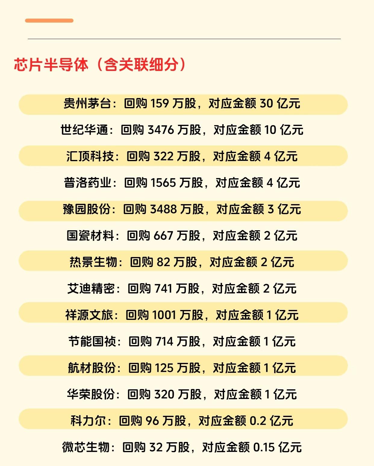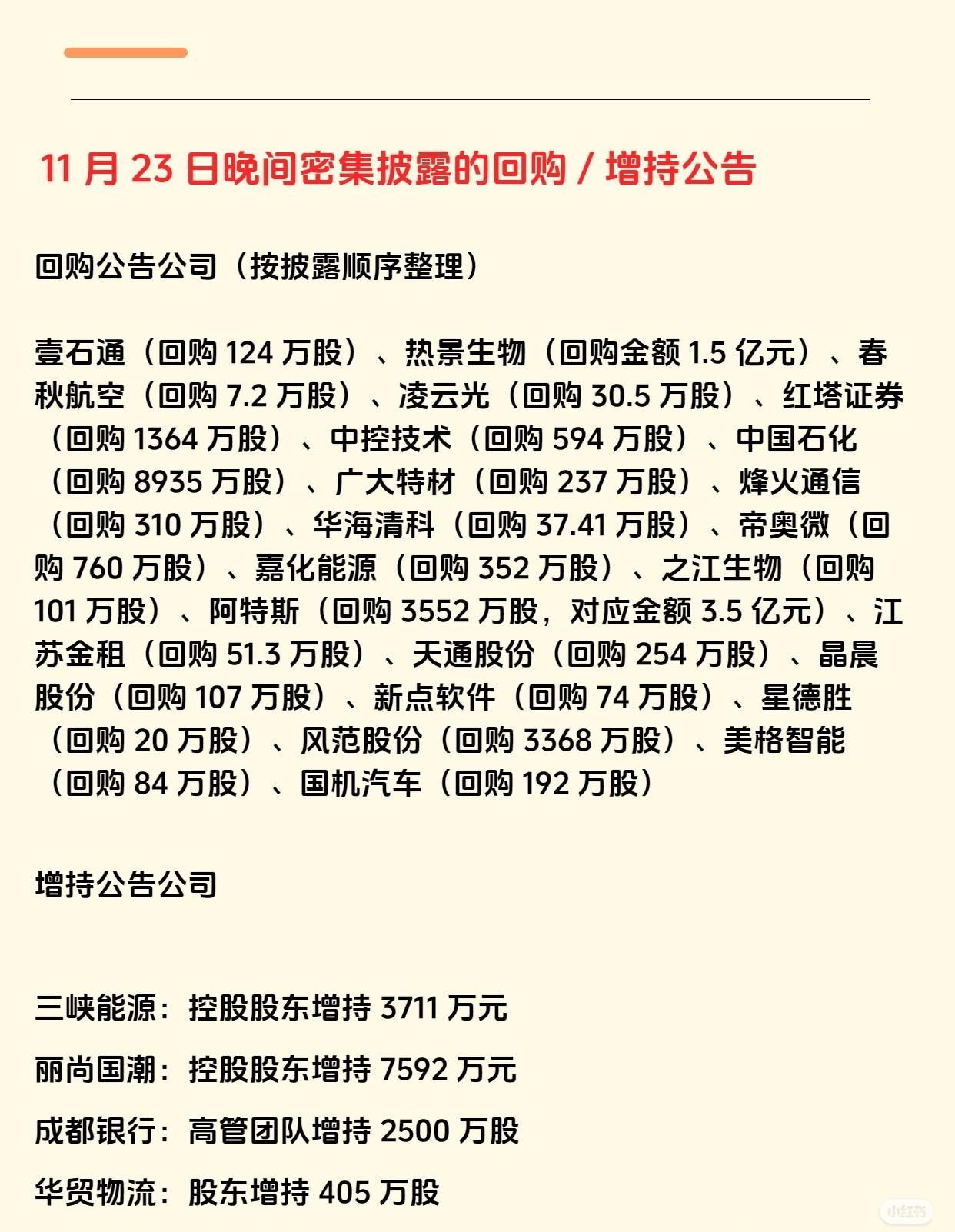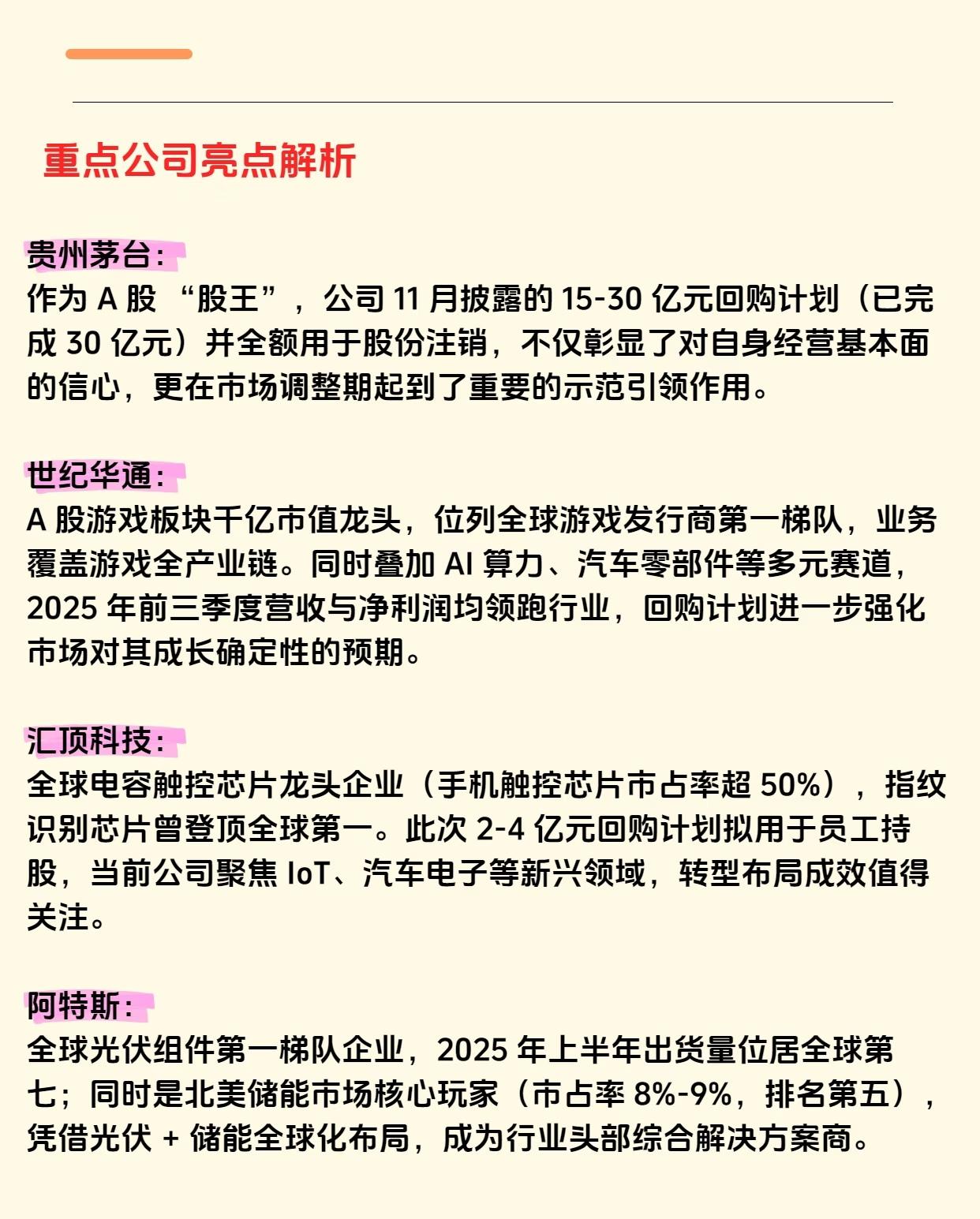 近期A股市场出现显著回调,投资者前期盈利回吐甚至面临本金浮亏,银行、证券、半导体、医药等多行业密集出现实控人及高管减持,叠加市场情绪波动,主动披露股份回购或增持计划的上市公司成为稀缺的信心支撑信号。 11月以来,已有14家A股公司发布回购公告。其中,“芯片半导体(含关联细分)”领域的回购信息涉及多家公司,如贵州茅台回购159万股、金额30亿元;世纪华通回购3476万股、金额10亿元;汇顶科技回购322万股、金额4亿元;普洛药业回购1565万股、金额4亿元;豫园股份回购3488万股、金额3亿元;国瓷材料回购667万股、金额2亿元;热景生物回购82万股、金额2亿元;艾迪精密回购741万股、金额2亿元;祥源文旅回购1001万股、金额1亿元;节能国祯回购714万股、金额1亿元;航材股份回购125万股、金额1亿元;华荣股份回购320万股、金额1亿元;科力尔回购96万股、金额0.2亿元;微芯生物回购32万股、金额0.15亿元。 重点公司亮点方面,贵州茅台作为A股“股王”,11月披露的15-30亿元回购计划已完成30亿元并全额注销,彰显对自身经营基本面的信心及市场示范作用;世纪华通是A股游戏板块千亿市值龙头、全球游戏发行商第一梯队,覆盖游戏全产业链,叠加AI算力、汽车零部件等多元赛道,2025年前三季度营收与净利润领跑行业,回购强化成长确定性预期;汇顶科技为全球电容触控芯片龙头(手机触控芯片市占率超50%)、指纹识别芯片曾登顶全球第一,2-4亿元回购拟用于员工持股,当前聚焦IoT、汽车电子等新兴领域,转型布局受关注;阿特斯属全球光伏组件第一梯队,2025年上半年出货量全球第七,且是北美储能市场核心玩家(市占率8%、排名第五),凭光伏+储能全球化布局成行业头部综合解决方案商。 此外,11月23日晚间有多家公司密集披露回购或增持公告。回购公告公司包括壹石通(124万股)、热景生物(1.5亿元)、春秋航空(7.2万股)、凌云光(30.5万股)、红塔证券(1364万股)、中控技术(594万股)、中国石化(8935万股)、广大特材(237万股)、烽火通信(310万股)、华海清科(37.41万股)、帝奥微(760万股)、嘉化能源(352万股)、之江生物(101万股)、阿特斯(3552万股、3.5亿元)、江苏金租(51.3万股)、天通股份(254万股)、晶晨股份(107万股)、新点软件(74万股)、星德胜(20万股)、风范股份(3368万股)、美格智能(84万股)、国机汽车(192万股);增持公告公司有三峡能源(控股股东增持3711万元)、丽尚国潮(控股股东增持7592万元)、成都银行(高管团队增持2500万股)、华贸物流(股东增持405万股)。 另有部分公司重要股东增持信息:隆基绿能董事长增持613万股、对应金额1亿元;中国石化核心股东增持13亿元;龙净环保核心股东增持1.2亿元;大豪科技控股股东增持545万股。