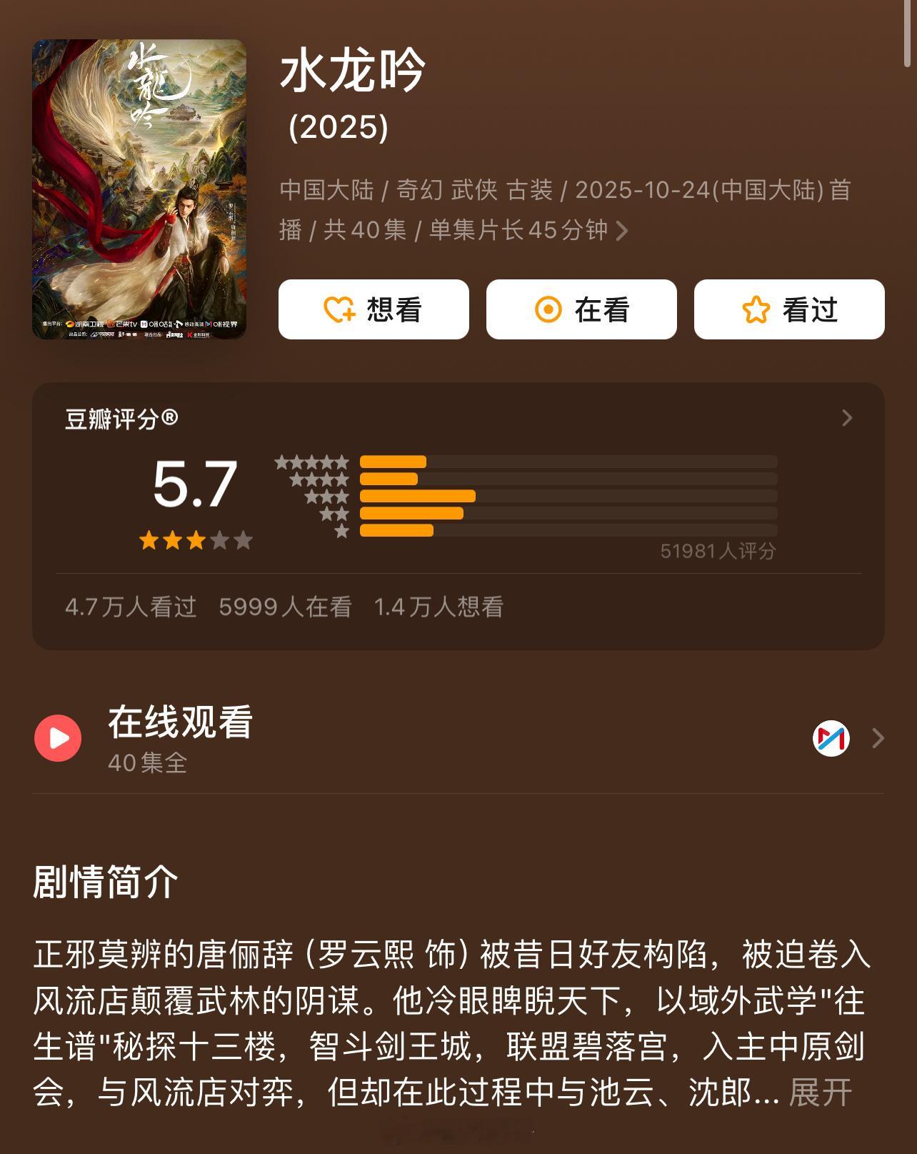 杨紫李现主演的《锦绣芳华》豆瓣7分,21.5万人看过罗云熙肖顺尧主演的《水龙吟》豆瓣5.7分,4.7万人看过水龙吟及格线都没过,确定有可比性吗?🥭确定不是虐粉做数据吗?芒果史冠
