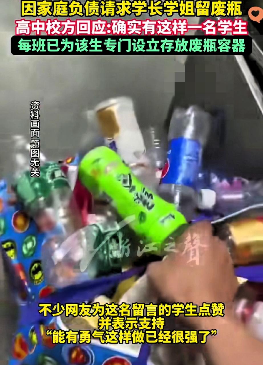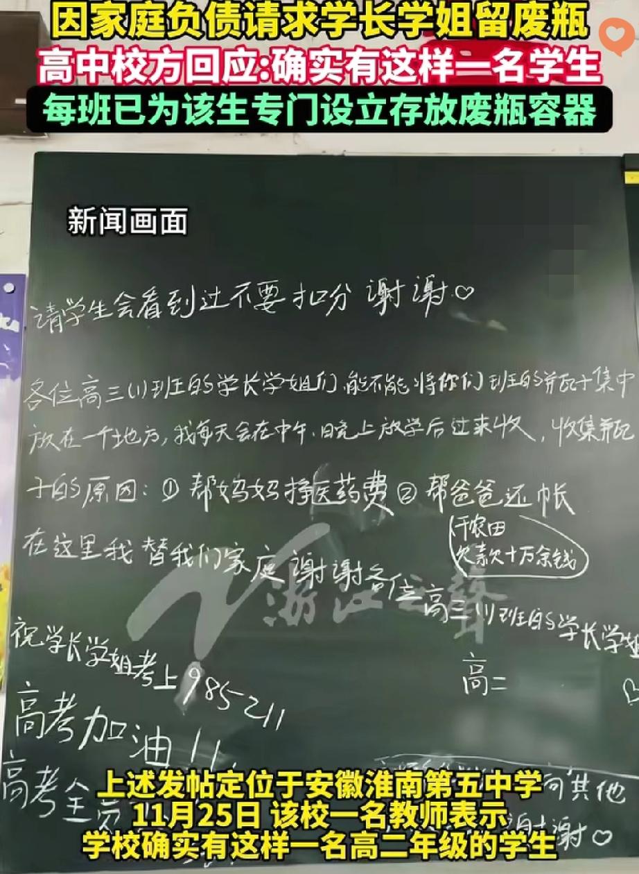 高二男生黑板上的留言,藏着最让人破防的担当! “请学生会看到不要扣分”,先替班级着想的小心翼翼,再说出“想要空瓶子帮妈妈挣医药费、替爸爸还债”的恳求,十来万的负债压在这个少年肩上,可他没抱怨没颓废,只想着用微薄之力扛起来。 这哪是普通的留言啊,分明是一个孩子最懂事的倔强。 他不要施舍、不求同情,只用自己能想到的方式,为家人撑起一片天,这份不卑不亢的责任感,比多少豪言壮语都动人。 老师和同学们的暖心配合,让善意有了落地的地方,也让我们看到,善良从来都是相互的。 真正的成长从不是年龄的增长,而是懂得为家人遮风挡雨。 你被这个少年的担当打动了吗?来评论区为他和家人送上祝福~