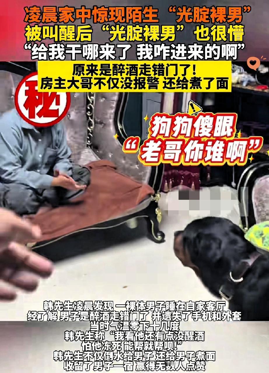 凌晨3点被狗叫醒,客厅竟躺个全裸陌生男!辽宁朝阳韩先生的经历,想想都头皮发麻! 韩先生后门从不锁,没想到竟让醉酒男子误闯进来,光着身子在沙发睡大觉。 喊醒后才知,男子喝断片,从朋友家跑错地方,手机证件全没带。 换谁遇到这事都得慌,但韩先生没报警没驱赶,看他不像坏人,还煮了碗面条让他歇到天亮。 郊区深夜又有玉米地,冻一夜或闯到别家,后果真不敢想。 这事儿既让人后怕,又透着暖心。 民风淳朴是底色,韩先生的善良更是给醉酒失误留了缓冲,但喝酒喝到断片闯陌生人家,也太危险了! 喝酒尽兴没问题,可总得有分寸感吧?你身边有过醉酒闹笑话或闯祸的事吗?来评论区说说~