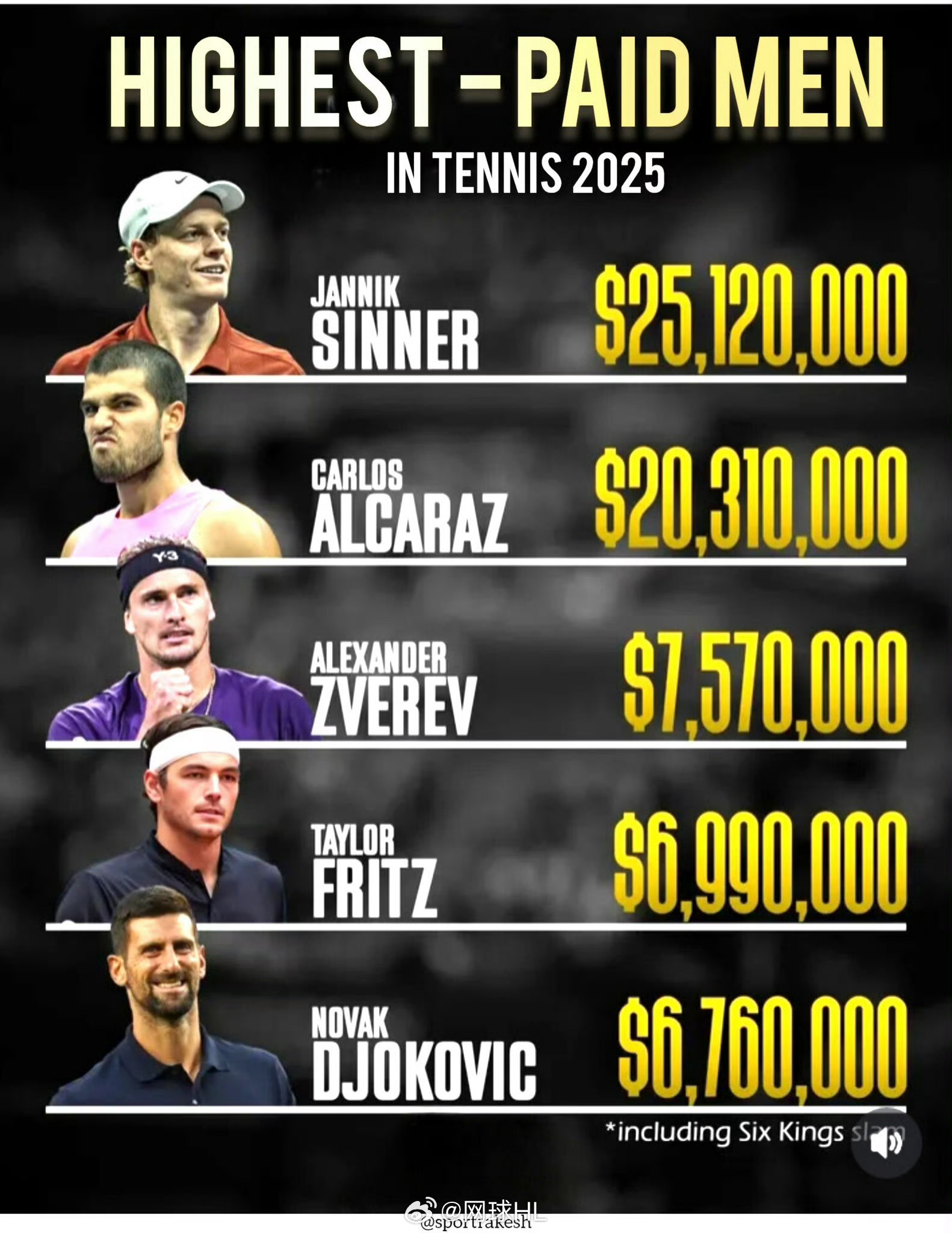 本赛季男子🎾球员奖金前五👇1 :辛纳 2512万美元2 :阿尔卡拉斯 2031万美元3 :兹维列夫 757万美元4 :弗里茨 699万美元5 :德约科维奇 676万美元网球talking大会
