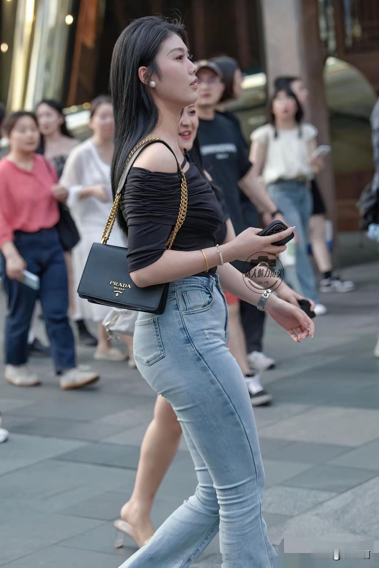长发妹子穿紧身牛仔裤逛街。