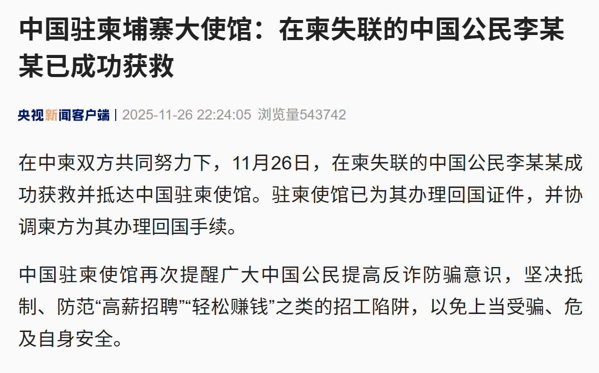【#仝卓在柬埔寨失联表弟已获救#】中国驻柬使馆消息:在中柬双方共同努力下,11月26日,在柬失联的中国公民李某某成功获救并抵达中国驻柬使馆。驻柬使馆已为其办理回国证件,并协调柬方为其办理回国手续。此前,演员仝卓25日晚在微博紧急求助,称表弟在柬埔寨失联多日。失联男子李怡亨家人表示,曾接到报平安电话,当时有人在旁提醒他要钱。中国驻柬使馆26日回应,得知这一消息后立即联系柬警方了解、核实相关情况,将继续密切跟进案件进展,切实维护在柬中国公民安全及合法权益。(综合)