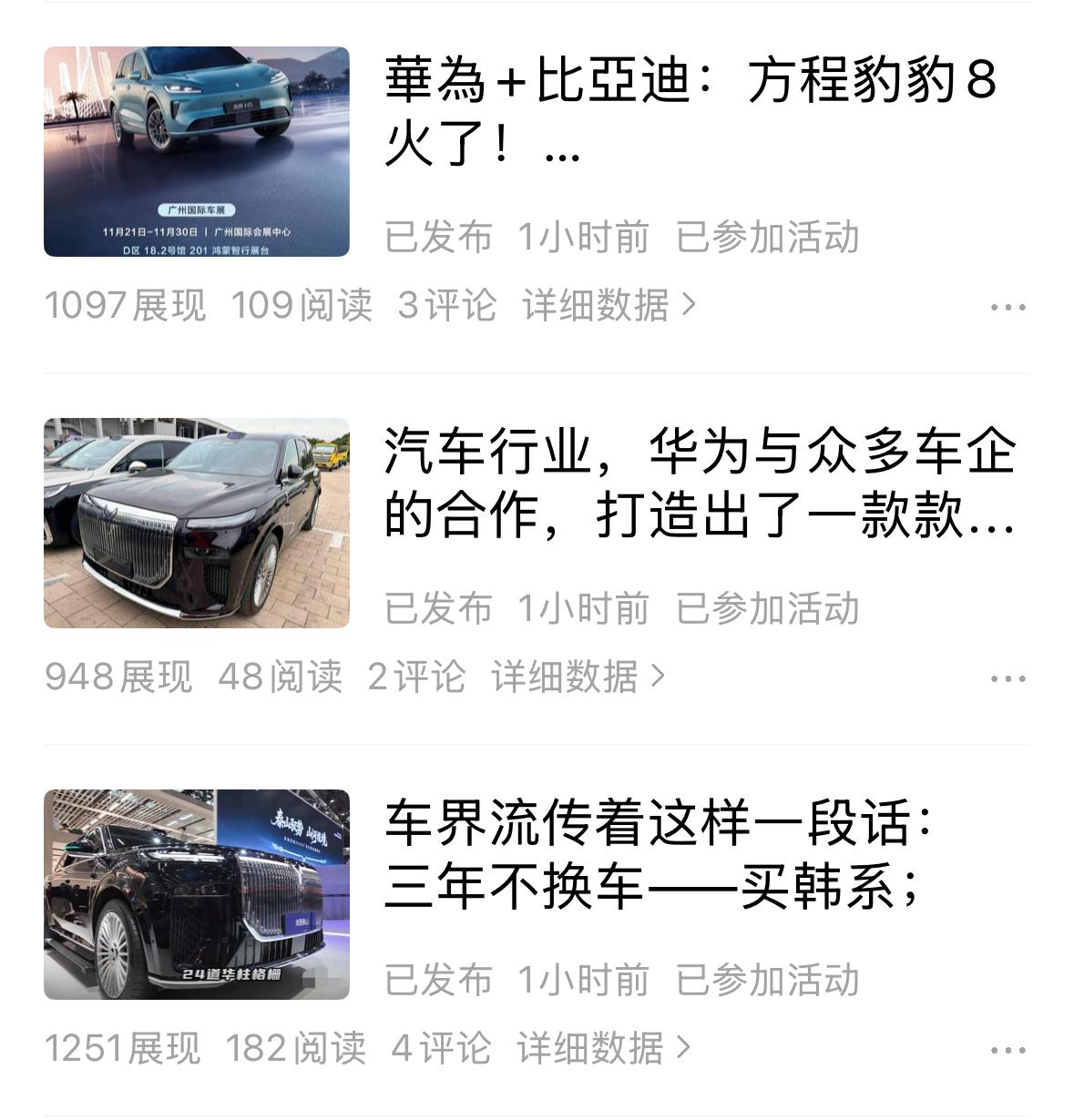 11月27日开启2025年广州国际车展征文第二期,每期需至少四篇,阅读量至少200。 昨晚就写了两篇放在草稿箱里,今早醒来第一件事就是发布草稿箱里的两篇车文,接着继续找材料写这款征文的第三篇第四篇。 发布第四篇的时候,一看,前面三篇已经超过总数200的阅读量了! 确认了一下眼神,汽车征文,注重文章的开头还是必要的!