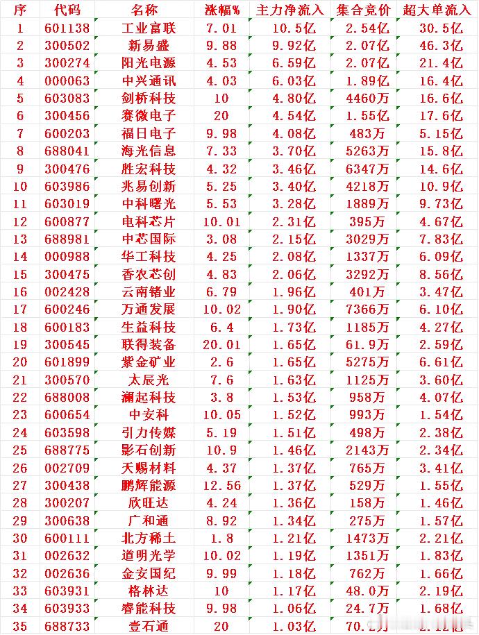11月27日开盘45分钟,主力资金“买入的 ”的名单一览!工业富联:净流入 10.5亿元新易盛:净流入 9.92亿元阳光电源:净流入 6.59亿元中兴通讯:净流入 6.03亿元剑桥科技:净流入 4.80亿元