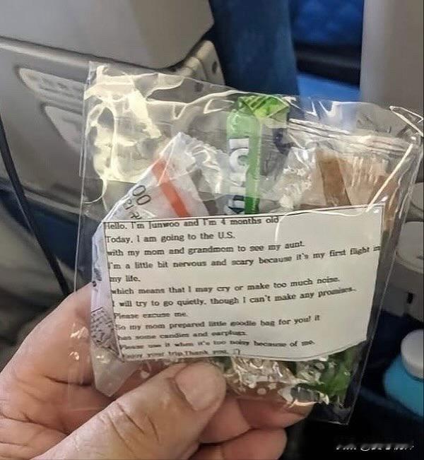 在从首尔飞往旧金山的航班上,一位韩国年轻母亲给每一位旅客分发了装有糖果和耳塞的礼