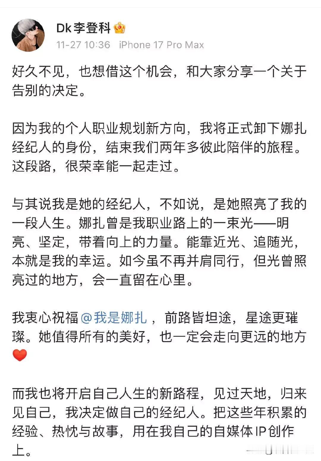 11月27日,娜扎经纪人李登科发文卸任,说因个人职业规划新方向,结束和娜扎两年多的陪伴旅程。 他称娜扎是自己职业路上的光,明亮坚定又有向上的力量,虽不再并肩,但光曾照亮的地方会留在心里,还衷心祝福娜扎前路坦荡、星途璀璨。卸任后,李登科打算做自己的经纪人,把积累的经验等用在自媒体IP创作上。 这一转变挺让人意外的,不过每个人都有新的追求,希望娜扎后续能有新的好发展,李登科的新事业也能顺风顺水。