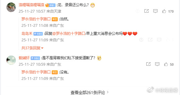 【罗永浩 录音呢# 27日,在罗永浩最新微博下有网友提问:“龙,录音还公布么?”罗永浩回复:“当然。”另有网友问:“是不是背着我们私下接受道歉了?”罗永浩回复:“没有。”(综合)