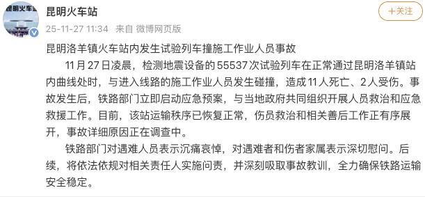 被时速约114公里的高速试验列车撞了会怎么样,确实难以想象。被时速114公里的小汽车撞了后的生还可能性已经是极低了,但其产生的动能也只有试验列车的几百分之一,可以预见那是一种不可抗拒的毁灭性力量,是瞬间致命的,没有生还可能性的。 11月27日凌晨,昆明洛羊镇火车站内就发生了试验列车撞施工作业人员的事故,造成11死2伤。 据官方通报,当时试验列车是正常通过,就没有减速的撞上了施工作业人员,也就在一瞬间11个人就永远的离开了人世间。