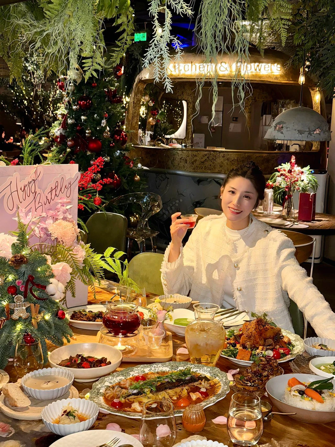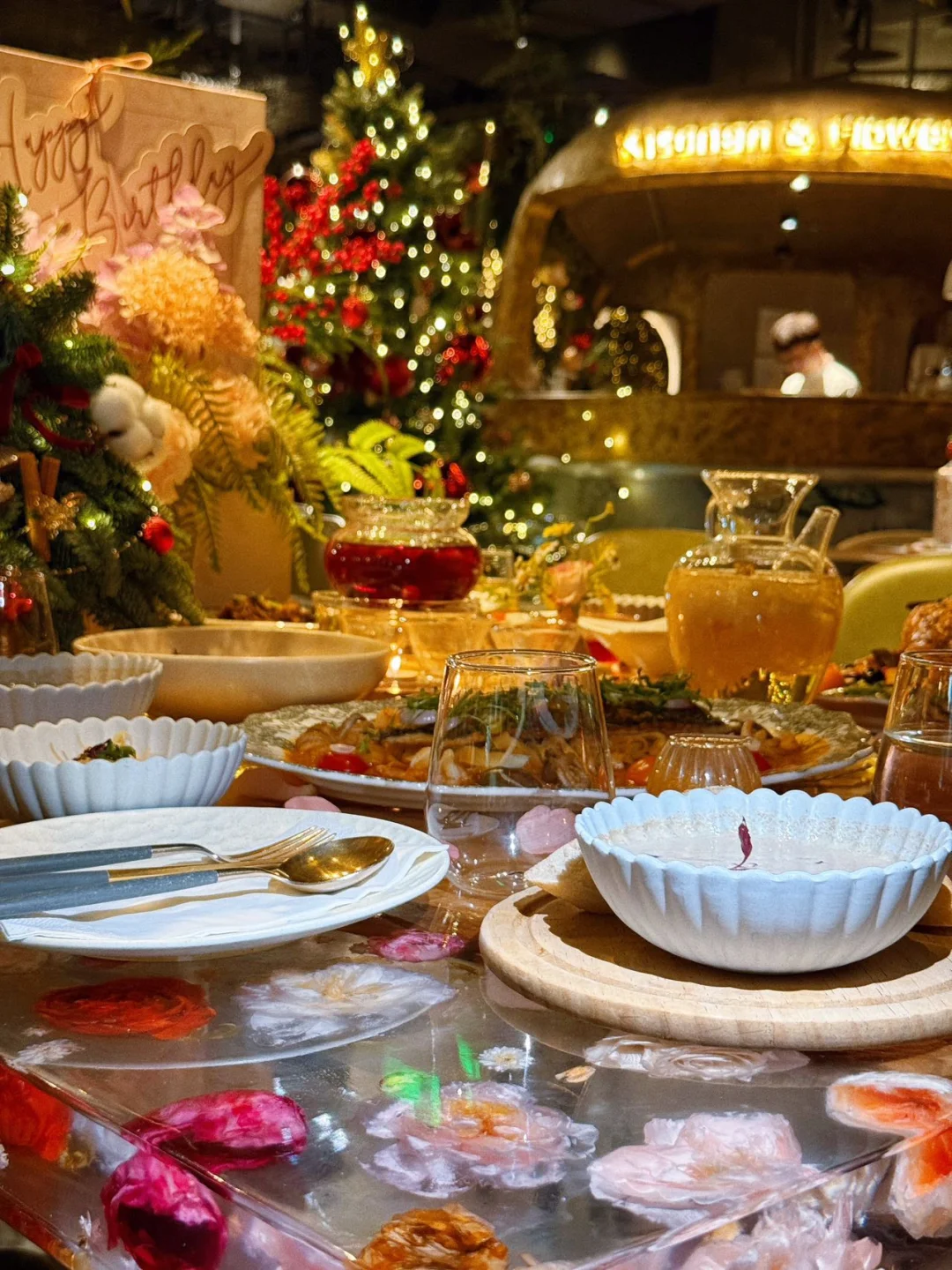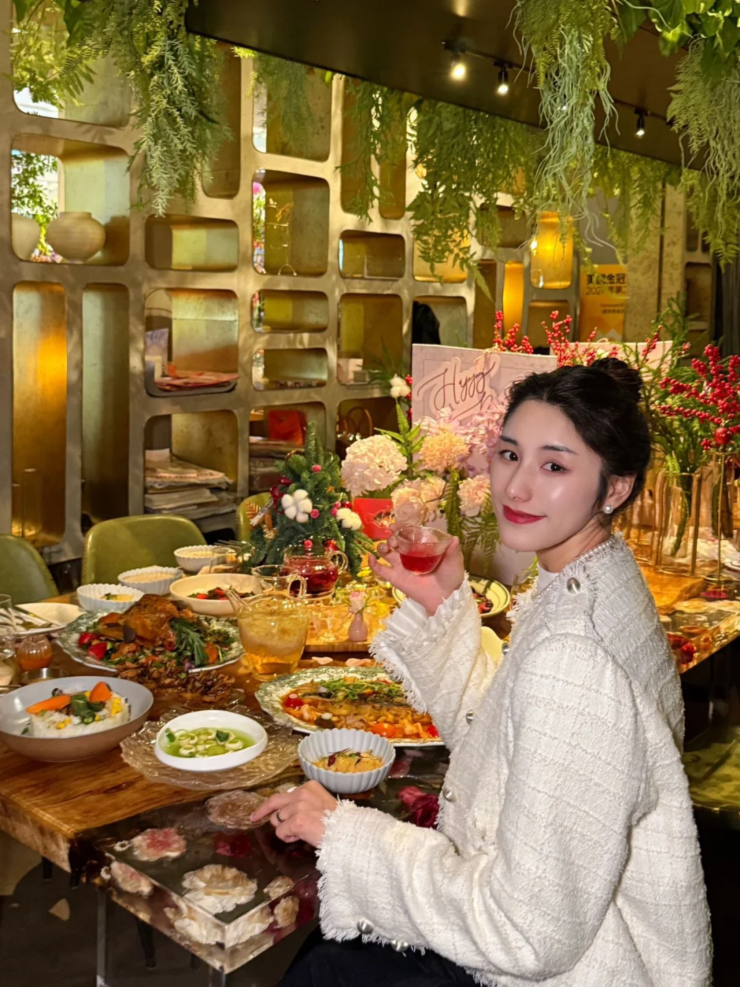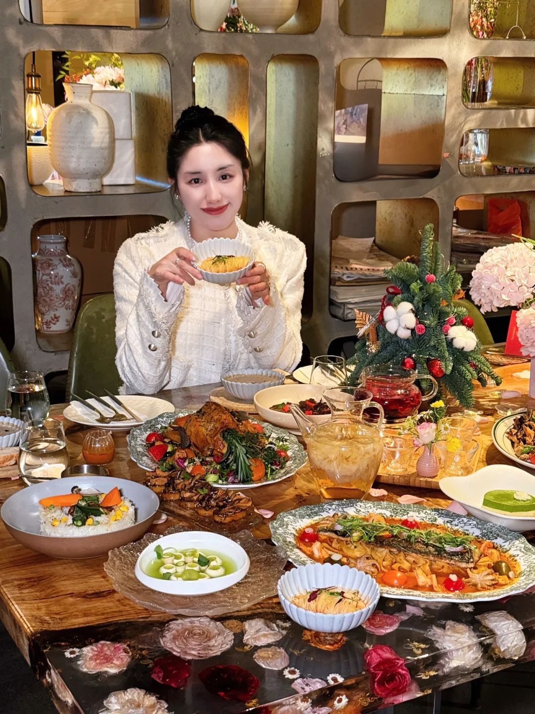 在北京从来不缺氛围感餐厅啊! 国贸这家门外是花店里面就是餐厅了🍴 花厨家就特别适合生日,过圣诞或者求婚🎎 氛围感拉满!被鲜花簇拥🌸 今天过去意外被门一张超长的玫瑰餐厅美到了 听店员说它的设计灵感汲取于奥地利诗⼈⾥尔克的同名法语诗歌,它的材质是稀缺的法国⽩杨树瘤木🪵 里面有超过200朵浪漫玫瑰🌸 太浪漫了💕像艺术品一样,所以一顿拍照🤳 ✅轻松拍出氛围感照片📷 ▫️人物坐在餐桌背景为圣诞树的一侧,人物放于左下四格,1倍取全部餐食拍摄 ▫️手端起来一个精致餐食,2倍取手里餐品,其他餐品为前景,制造高低错落的视觉感! ▫️避开人群,坐餐桌内侧,镜头放低以餐桌内光之玫瑰为前景,既能拍出餐桌的高级又能避免旁人入境 ✅小Tips: ▫️室内光线偏暗,记得带闪光灯 ▫️衣服穿偏浅色,或者礼服款式更出片 ✅菜品 他们家新出的圣诞新菜品黑松露烤鸡配蜂蜜南瓜蔬菜沙拉🥗,柠香海鲈鱼🐟和牛眼肉配山笋味道也超不错,总之环境和菜品都💯!