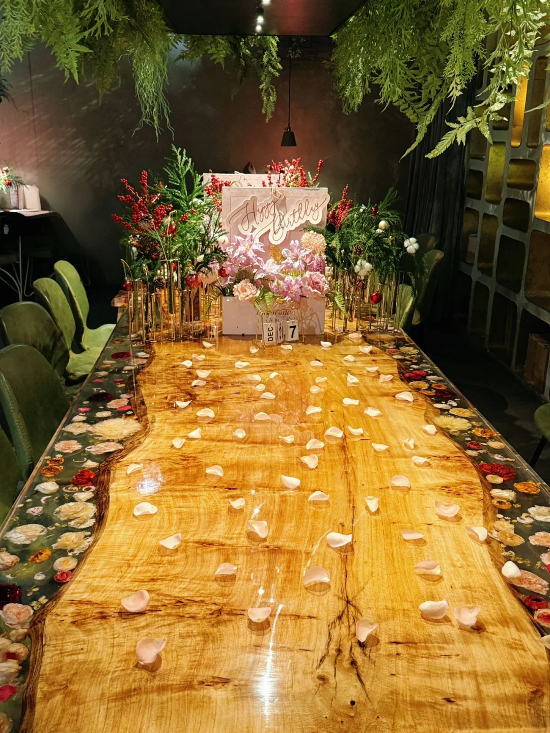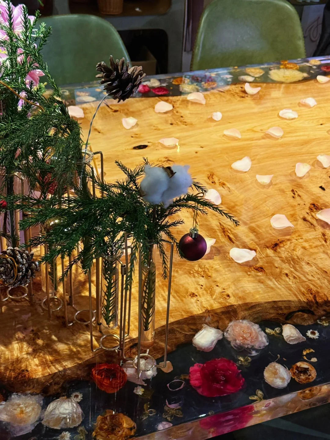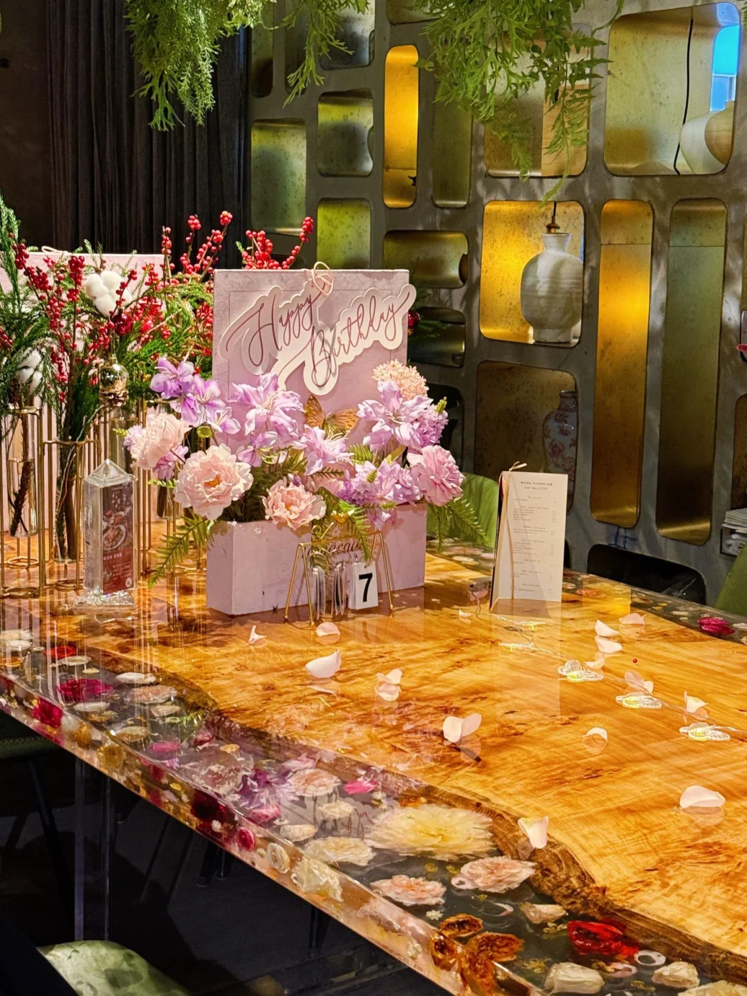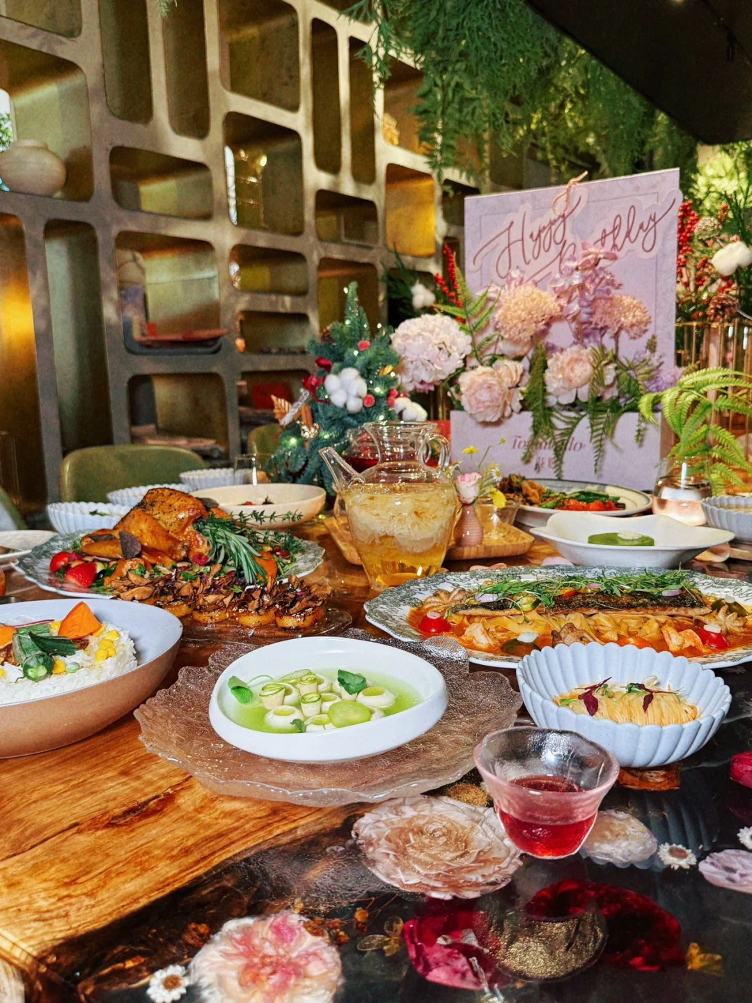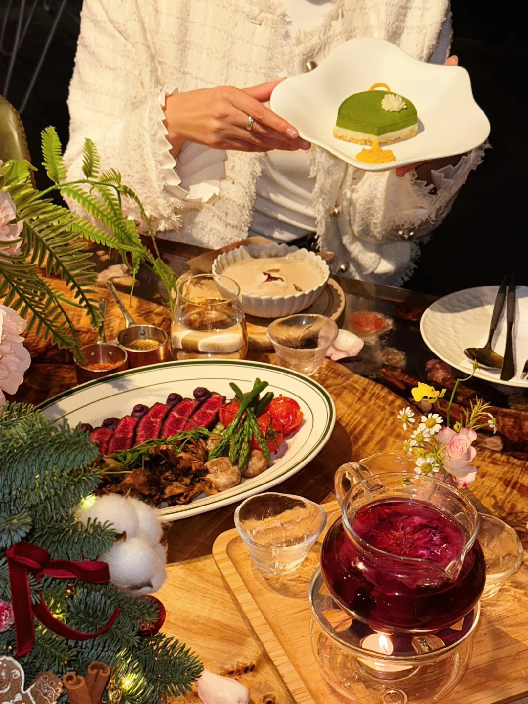 在北京从来不缺氛围感餐厅啊! 国贸这家门外是花店里面就是餐厅了🍴 花厨家就特别适合生日,过圣诞或者求婚🎎 氛围感拉满!被鲜花簇拥🌸 今天过去意外被门一张超长的玫瑰餐厅美到了 听店员说它的设计灵感汲取于奥地利诗⼈⾥尔克的同名法语诗歌,它的材质是稀缺的法国⽩杨树瘤木🪵 里面有超过200朵浪漫玫瑰🌸 太浪漫了💕像艺术品一样,所以一顿拍照🤳 ✅轻松拍出氛围感照片📷 ▫️人物坐在餐桌背景为圣诞树的一侧,人物放于左下四格,1倍取全部餐食拍摄 ▫️手端起来一个精致餐食,2倍取手里餐品,其他餐品为前景,制造高低错落的视觉感! ▫️避开人群,坐餐桌内侧,镜头放低以餐桌内光之玫瑰为前景,既能拍出餐桌的高级又能避免旁人入境 ✅小Tips: ▫️室内光线偏暗,记得带闪光灯 ▫️衣服穿偏浅色,或者礼服款式更出片 ✅菜品 他们家新出的圣诞新菜品黑松露烤鸡配蜂蜜南瓜蔬菜沙拉🥗,柠香海鲈鱼🐟和牛眼肉配山笋味道也超不错,总之环境和菜品都💯!
