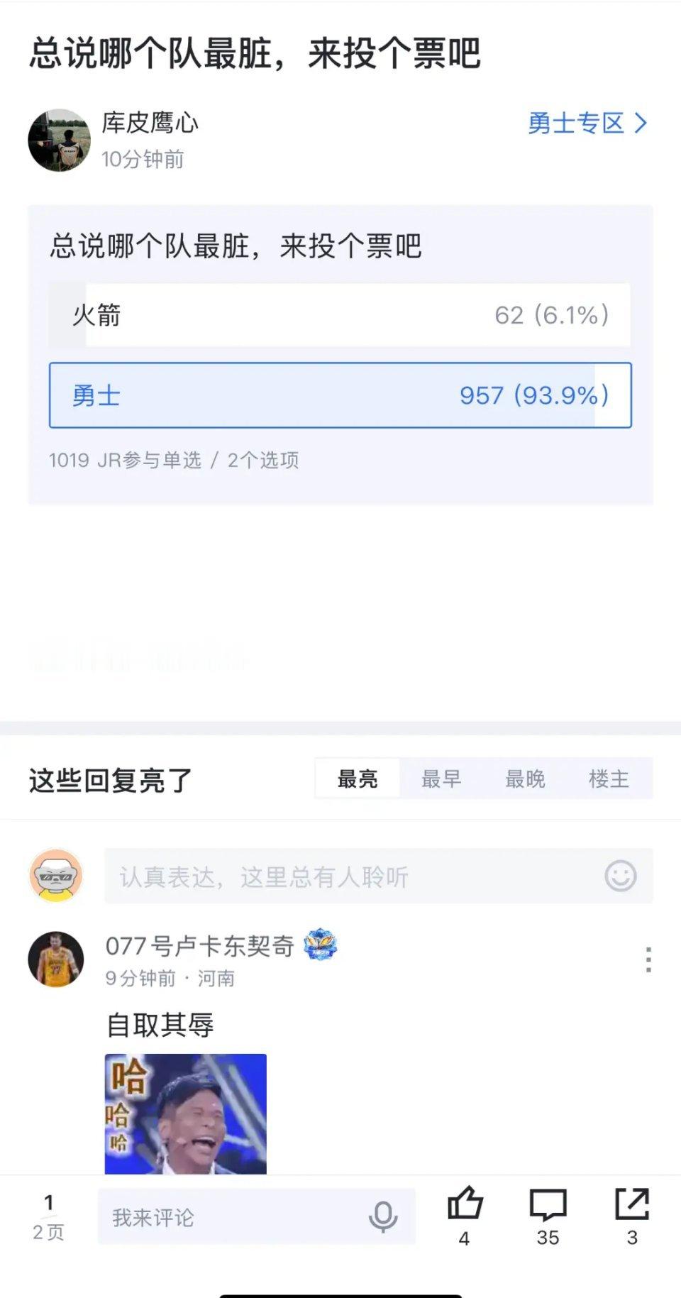 自取其辱?库里球迷在勇士专区投票“火箭勇士谁更脏”,万万没想到:勇士更脏!火箭战胜勇士曝库里右大腿挫伤