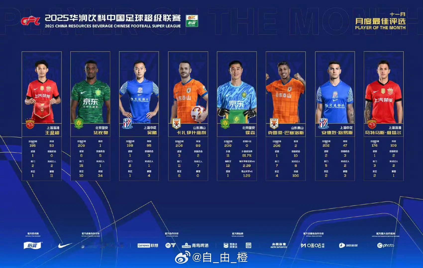 2025中超联赛官方月度最佳球员评选(十一月),瓦科、克雷桑入选。自由橙山东泰山