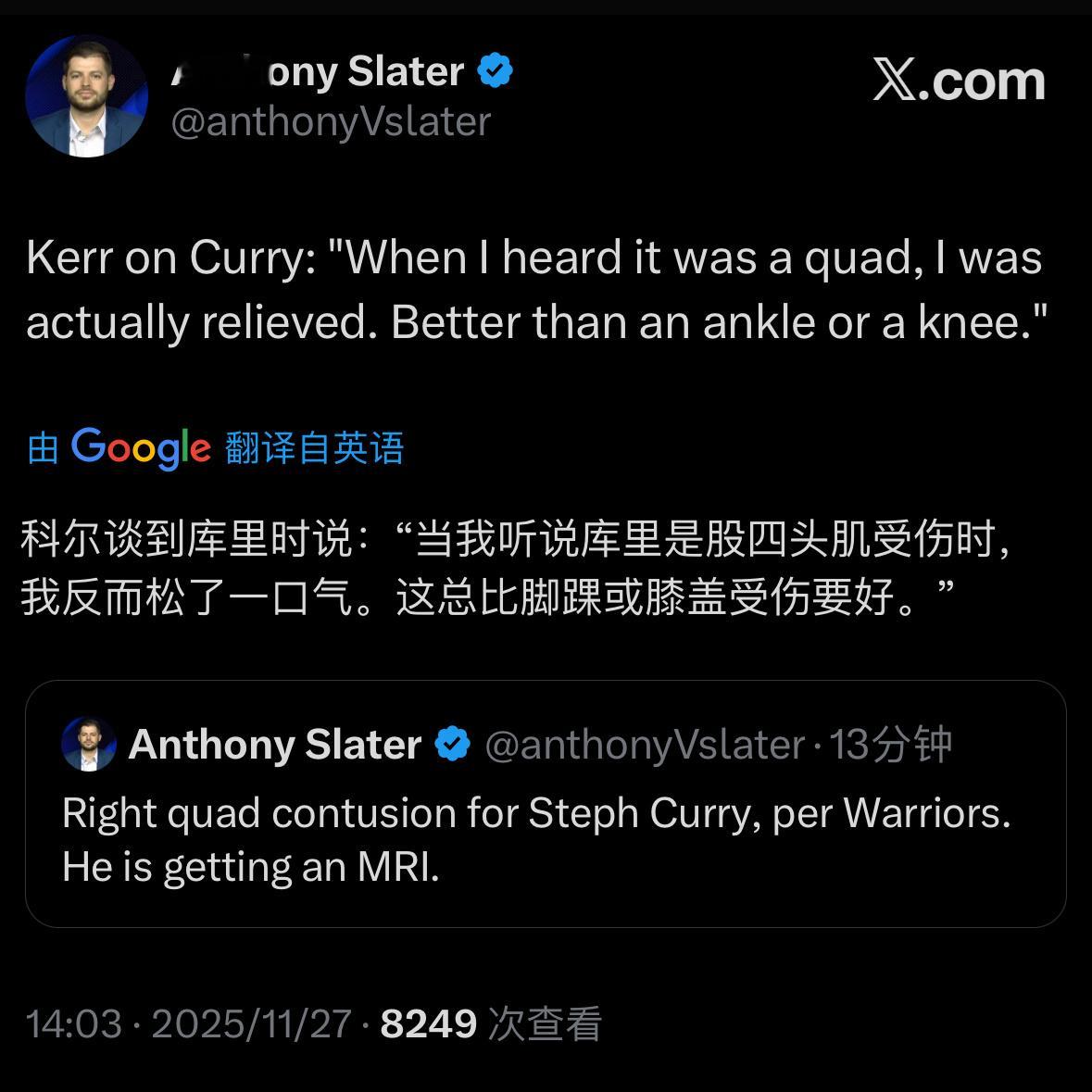 科尔谈库里受伤“当我听说库里是股四头肌受伤时,我反而松了一口气,这总比脚踝或膝盖受伤要好。”现在只能等待MRI的检查结果了火箭vs勇士