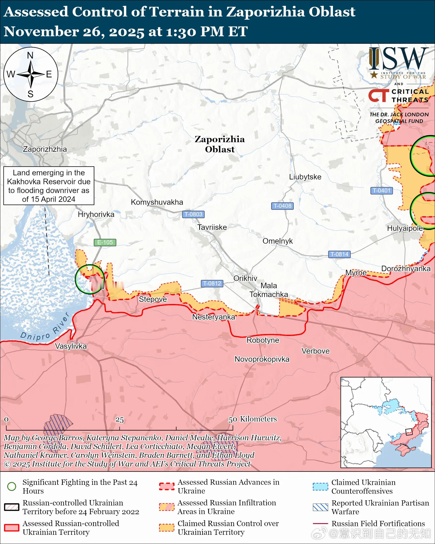 南方轴心俄军目标:守住前线阵地,确保后方免受乌克兰军队袭击,并推进至扎波罗热市的火炮射程之内。乌克兰军队最近向胡利亚波列方向推进。乌克兰军队取得进展的评估:11 月 26 日,一名乌克兰军方消息人士报告称,乌克兰军队已推进至丹尼利夫卡以西(胡利亚伊波列以北)的 T-0401 波克罗夫斯克-胡利亚伊波列公路。俄罗斯声称占领的区域范围:11 月 25 日发布的地理定位视频显示,俄军在东部的胡利亚伊波列袭击了一辆乌克兰车辆,此前俄方声称俄军在该地区驻扎。未经证实的说法:俄罗斯军事博客作者声称,俄军在胡利亚伊波列东南部、扎里奇涅东南部(胡利亚伊波列西北部)、多布罗皮利亚东部和瓦尔瓦里夫卡东部(均在胡利亚伊波列北部)推进。俄军在胡利亚波尔附近发动进攻; Hulyaipole 西北,Zarichne 附近; Hulyaipole以北,靠近Yablukove、Dobropillya和Rivnopillya,并向Zelene和Varvarivka方向; Hulyaipole 东北部,靠近 Solodke、Krasnohriske、Pryvilne; 11 月 25 日至 26 日在 Hulyaipole 以东靠近 Zatyshshya、Zelenyi Hai、Vesele 和 Vysoke 的地方。俄罗斯军事博主声称,乌克兰军队从索洛德克到里夫诺皮利亚以及维德拉德内(Hulyaipole以北)附近进行了反击。乌克兰南部防卫军发言人弗拉迪斯拉夫·沃洛申上校报告称,乌克兰军队已撤退至维索克附近更有利的阵地,但截至11月26日,俄军尚未占领该村。沃洛申表示,尽管乌克兰军队已经撤退,但俄军仍无法向该村增派援军。乌克兰南部防卫军于11月26日报告称,俄军夸大了推进的说法,以达到宣传目的,尽管胡利亚伊波列方向的局势仍然紧张。乌克兰南部防卫军报告称,乌克兰军队每天给俄军造成250至300人伤亡。乌克兰南部防卫军报告称,俄军尚未包围乌克兰军队,乌克兰军队仍然能够进行后勤补给和人员撤离。俄罗斯军事博客作者声称,俄军正在胡利亚波列附近进行 FAB-500 制导滑翔炸弹和 TOS-1A 温压火炮打击。作战序列:俄第11集团军(俄罗斯空天军[VKS]和东部军区[EMD])的无人机操作员正在安德里夫卡(胡利亚伊波列以北)和胡利亚伊波列附近的乌克兰阵地进行打击。第127摩步师(第5合成集团军[CAA],东部军区[EMD])正在胡利亚伊波列附近作战。第143摩步团(第127摩步师,第5合成集团军,东部军区[EMD])正在扎波罗热方向作战。11月26日俄军继续在扎波罗热州西部发动进攻,但并未取得进展。11月25日和26日,俄军在奥里希夫以南的新达尼利夫卡附近、奥里希夫西南的新安德里夫卡附近以及奥里希夫以西的普里莫尔斯克附近发动了进攻。一位俄罗斯军事博主声称,在扎波罗热方向作战的一个营“几乎全军覆没”,只剩下连长、排长和士官。该博主称,增援部队正从训练场抵达该营并向斯捷普诺戈尔斯克发起进攻,但10到12名新兵中只有3到5人幸存。该博主还声称,俄军指挥部正在将战斗车辆炮手调往步兵突击部队,导致许多车辆无人驾驶。乌克兰专栏作家瓦迪姆·库什尼科夫11月26日报道称,俄军于11月22日晚首次使用配备夜视摄像头的“闪电”(Molniya)无人机对扎波罗热市发动了袭击。库什尼科夫指出,俄军自2024年夏季以来一直在使用此类无人机,并于2025年6月对其进行了现代化改造。库什尼科夫还表示,俄军将“闪电”无人机用作母舰,搭载(FPV)无人机。该无人机航程可达40公里,最多可携带10公斤炸药。乌克兰总参谋部报告称,乌克兰军队对俄第58合成集团军(南方军区)一个指挥所进行了无人机袭击,该指挥所位于被占领的瓦西里夫卡(位于俄罗斯近后方奥里希夫西南,距离前线约12公里)。作战序列:据报道俄第 71 摩步团(第 42 摩步师、第 58 集团军)正在新达尼利夫卡作战。第 7 空降师(VDV)正在奥里希夫方向作战。11月26日俄军继续向赫尔松方向发起有限的地面进攻,但并未取得进展。11月25日和26日,俄军在赫尔松市以东的安东尼夫斯基桥附近发动进攻。作战序列:据报道俄第 98 空降师的无人机操作员和其他部队正在赫尔松方向作战。