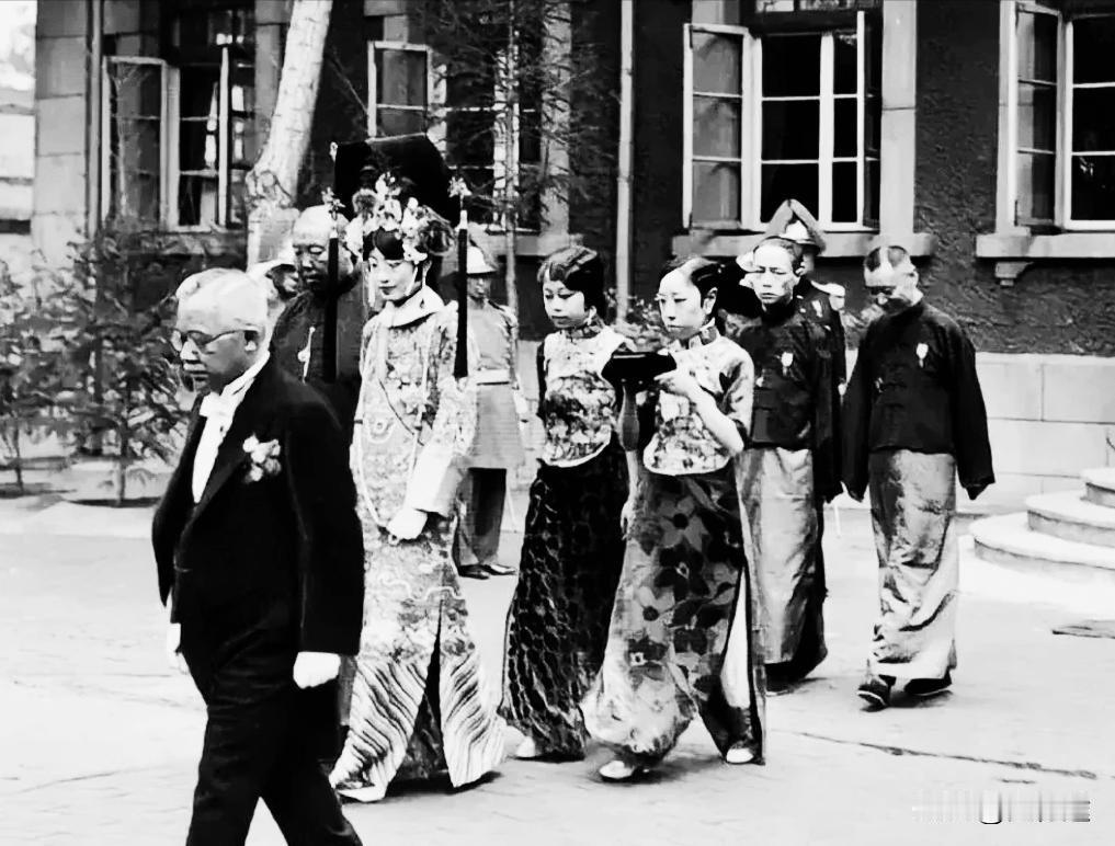 民国时期,在天津的婉容出行照片,依然穿着宫廷旗装,身边还是跟着太监、宫女等仆从,虽然看起来气派,但是与当年在紫禁城时已经不可同日而语。 天津街口那天,人多车杂,电车叮当,洋招牌挤成一排,中间那一队人却像从别处搬来的戏班。 仆人开道,太监宫女簇拥,一位旗装女子收腰挺背,脚步按着宫里节奏走,有人悄声认出,那是末代皇后婉容,从紫禁城挪到租界街上的旧朝影子。 她的来路落在北京什刹海帽儿胡同。 父亲郭布罗荣源当过兵部官员,母亲爱新觉罗恒馨是毓朗贝勒之女,生她那年因产褥热去世,由恒馨的姐姐恒香接续这门亲。 家里讲规矩,也舍得花钱,请英文和琴画老师轮流上门,既念经史也学西乐。 1913年清廷垮台后,一家搬到天津租界,她七岁进教会学校,白天读洋书唱圣歌,回家照旧给长辈行礼做女红。弟弟润麟记得,她嘴上守旧,性子却温和,常耐着心教他写字画画,他把闺房弄乱,她只笑骂两句就算了。 在这样的缝隙里,人渐渐长成。 贵族圈里传她长得端庄、气质清爽,琴棋书画都拿得出手,长辈心里打的算盘,是给她找一门体面的婚事,命运拎她走的却是另外一条路。 到十七岁那年,消息忽然落到天津。 1922年三月,溥仪下旨,荣源之女立为皇后,端恭之女额尔德特文绣封为淑妃;十七日,她从天津乘专列回北京,帽儿胡同老宅翻修挂彩,等了八个月,十一月三十日大婚,礼乐齐备。 婚礼第三天,她在东暖阁第一次公开露面,两把头梳得光亮,黄缎旗袍贴身,各国使节夫人看得连连点头,报纸抢着写“末代皇后初见”,把她推上风口。 宫门一关,热闹退场,空当涌出来。 这个皇后有名无权,仪式一套套,真正要办的事并不多,她把在天津养成的习惯带进宫,爱看外国电影,爱吃西餐,会骑自行车,也会在小纸条上用外文写几句情话放到溥仪案头。 骨子里又认这个位置,1923年十二月北京闹灾,她拿出大洋六百元捐给“临时窝窝头会”,为灾民凑窝头钱,社会上也有人夸她一声仁心。 女人多,针脚细。 文绣被封淑妃,表面姐妹相称,背地里较劲,买东西要比,站位要抢,溥仪多看谁一眼,另一边心里就不平衡。 1924年冯玉祥政变,溥仪被赶出紫禁城,1925年一家搬进天津日租界张园,后来又迁静园,房子小了,束缚松了。 婉容穿细腰旗袍,踩高跟鞋,常逛惠罗公司、中原公司、劝业场,去起士林、利顺德吃西餐,故宫里珍珠软手镯、钻戒、镶宝石烟盒,有不少就是在天津买的,上头刻着“天津”两个字,溥仪笑她是“天津大小姐”,花钱买没用玩意的门道比他多。 1931年,全国十六省遭水灾,溥仪捐出一幢楼,她咬牙把自己心爱的一串珍珠项链捐掉,一百七十二颗,当初花了二千五百元,点名要赈济湖北,《大公报》写“溥浩然夫人捐珍珠赈灾”,说这串珠子是给灾民“续命”的。 风光的一面有珠宝、有笑声、有“天津大小姐”,底下那层却在开裂。 1931年文绣闹离婚,闹到报上,溥仪面子挂不住,怒气慢慢转到身边这个皇后身上,说话越来越少,问她心思的工夫越来越少,把她当成礼仪上必须摆出的标配。 多年后他在自传里认过错,说从那以后几乎不跟她谈心,她的苦闷、愿望都不放在心上,一个背着皇后名号的女人,既想活得像普通人,又放不下这块牌子,只能硬撑。 这一年局势也在转弯。1931年十一月十日,溥仪在日本人帮衬下悄悄离开天津,先往东北去;二十六日,婉容才离津,经大连、旅顺与他会合,伪满洲国一成立,他成了傀儡,她成了陪衬。 其实早在紫禁城,她就在溥仪默许下吸鸦片,说是大夫开的药,到长春以后分量一天比一天大,家里本就有精神病史,人被毒和病一起往下拖。 伪满宫里的那桩事,后来传遍街巷。 她和侍卫暗中来往,怀孕生下一名女婴,消息传到溥仪那里,他气得下令把孩子丢进锅炉烧掉,对她却说,是交给哥哥抚养,每个月还让人从她手里拿一笔“养育费”,她一直信这套说法,以为外面真有个孩子在长大,梦里常常伸手去抱。 从那以后,她整个人垮下来。 毒瘾缠身,精神失常,走路费劲,眼睛模糊,说笑、发火都没征兆,北京北海公园里曾经戴墨镜、身段苗条的二格格,只剩旧照片。 945年八月十五日之后,局势散架,溥仪忙着逃命,两口子各走各路,1946年婉容在战乱中死于延吉监狱,终年四十岁。 后来在清西陵给她立了衣冠冢,选了一张年轻时的照片当遗像,坐姿端正神情安静。 天津街头那张出行照留到今天,仆从早散,旗装早退,只剩下那双有点发怔的眼睛,气派算有一点,同紫禁城里的威风比起来,却像隔了一整辈人。