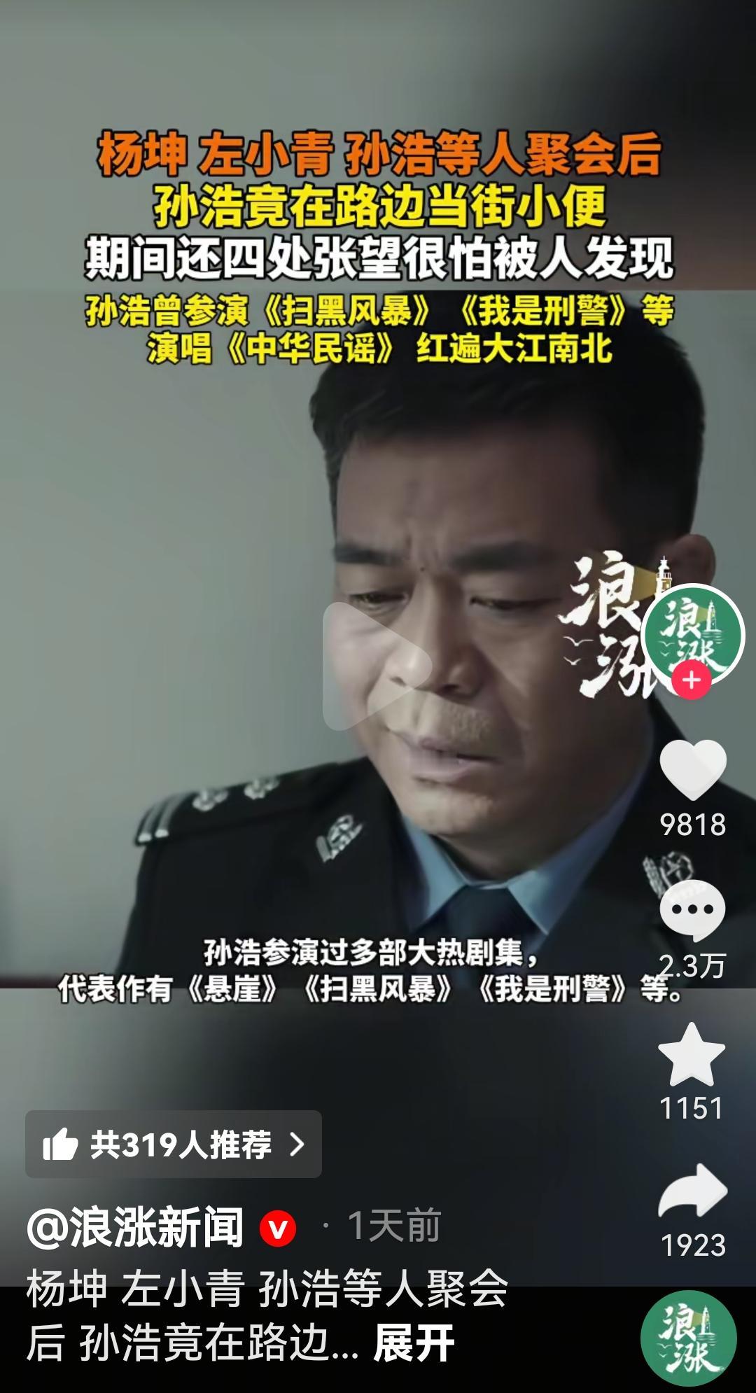 演员孙浩老师在和朋友聚会后在路边小便 网友都说他很礼貌呢,还四处张望一下 他做了大部分男人喝过酒都做过的事情 网友在他网络平台账号评论说,尿就尿了 ,人之常情,孙浩老师回复说抱歉 网友说在娱乐圈里没吸毒,没嫖娼,没偷税已经不错了 大家怎么看孙浩演技 孙浩老歌 孙浩歌曲合集 孙浩男 图片来自浪潮新闻视频