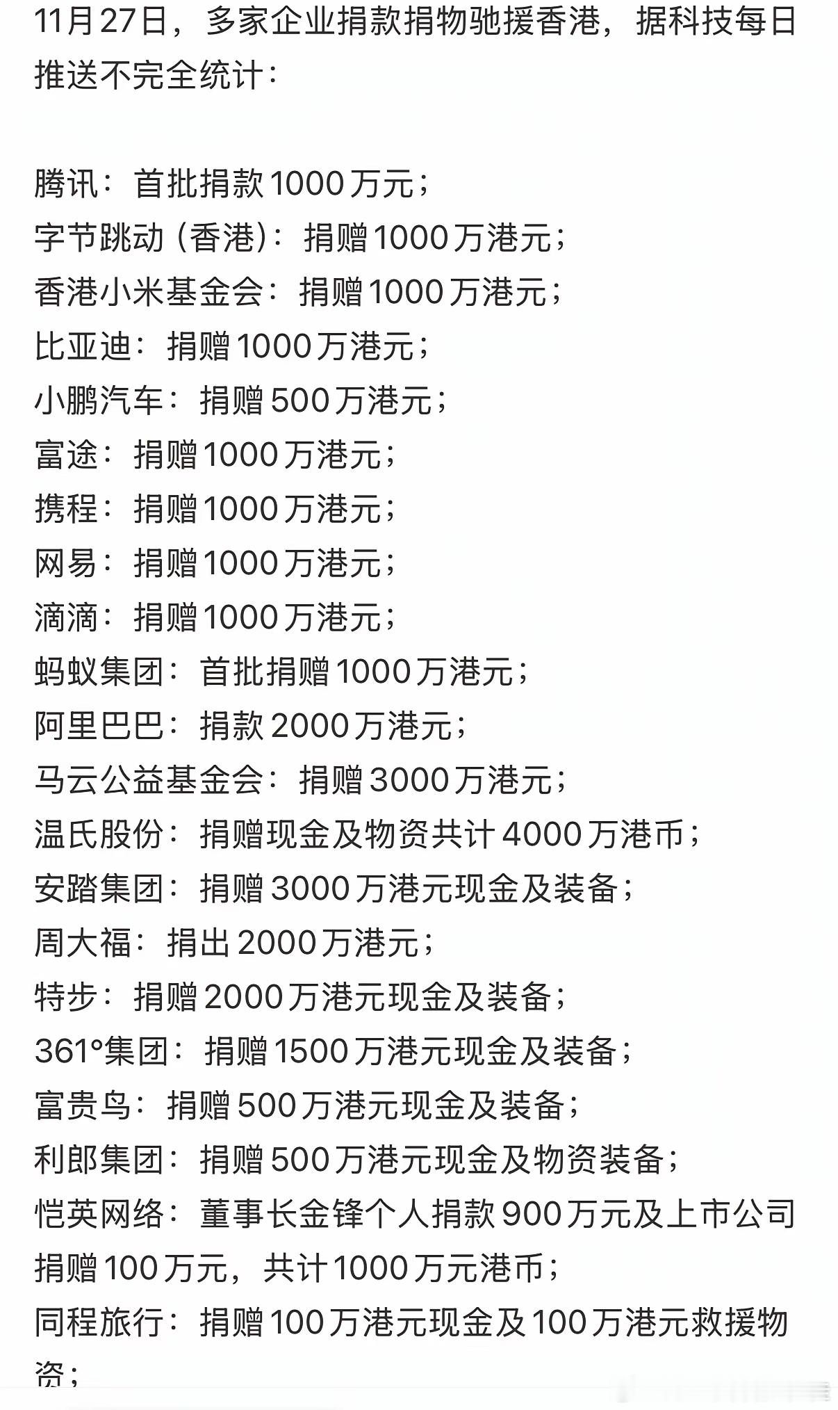 果然没让人失望香港火灾发生后,大陆企业家们纷纷伸出了援手!据统计已经捐了2.9亿港元!真是患难见真情!想当年香港慈善捐款这块没得说!大陆很多自然灾害都有捐款,香港都不含糊,像当年经历汶川地震,香港各界一共给四川捐了120多亿!91年洪水,当时香港还没回归也有慈善募捐现在香港有难也体会到了社会各界的温暖!我们都是一家人,有难的时候一条心,共同面对克服所有的困难,一起互助互勉,渡过难关!