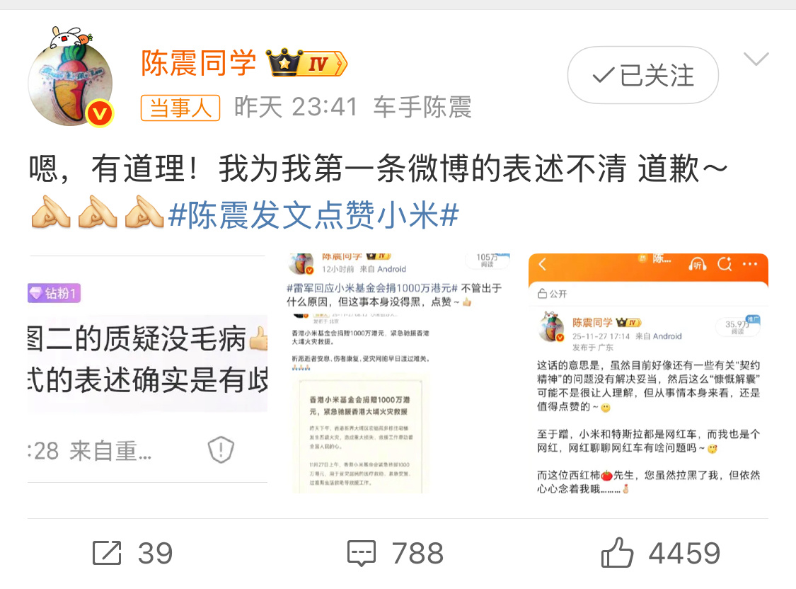 陈震为表述不清道歉车手陈震为表诉不清道歉,应该也算在给小米道歉吧?