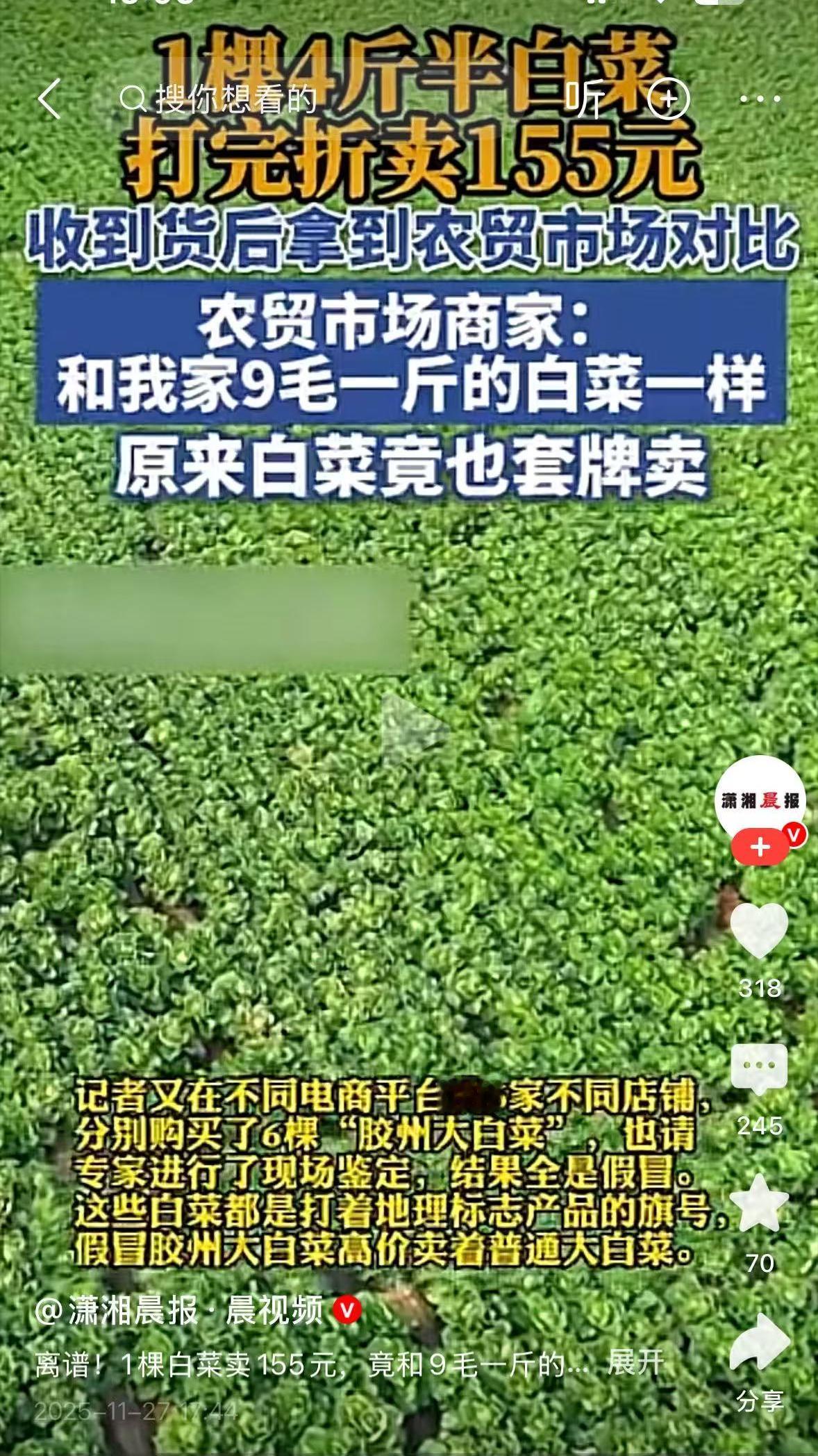 白菜也开始按牌子来卖了? 155元一颗的品牌白菜和9毛一斤的普通白菜有什么区别? 有人在网上买了一颗4斤半的胶州大白菜,打完折是155元,收到货之后拿到农贸市场对比。 结果发现和市场卖9毛钱一斤的白菜一模一样,经过专业人士鉴别之后发现是虚假宣传。 之后他又在不同的电商平台上的不同店铺买了6棵“胶州大白菜”,结果收到货之后全是假的。 这些商家是把消费者当冤大头了吗? 同样是白菜,为什么价格差距这么大呢?胶州大白菜为什么能卖这么贵? 主要是这么贵的白菜还有很多人买。 有的人总会抱着越贵越好的心态买东西,但是有时候不是越贵的东西越好。 不过我们普通老百姓过日子,肯定选便宜实惠的。